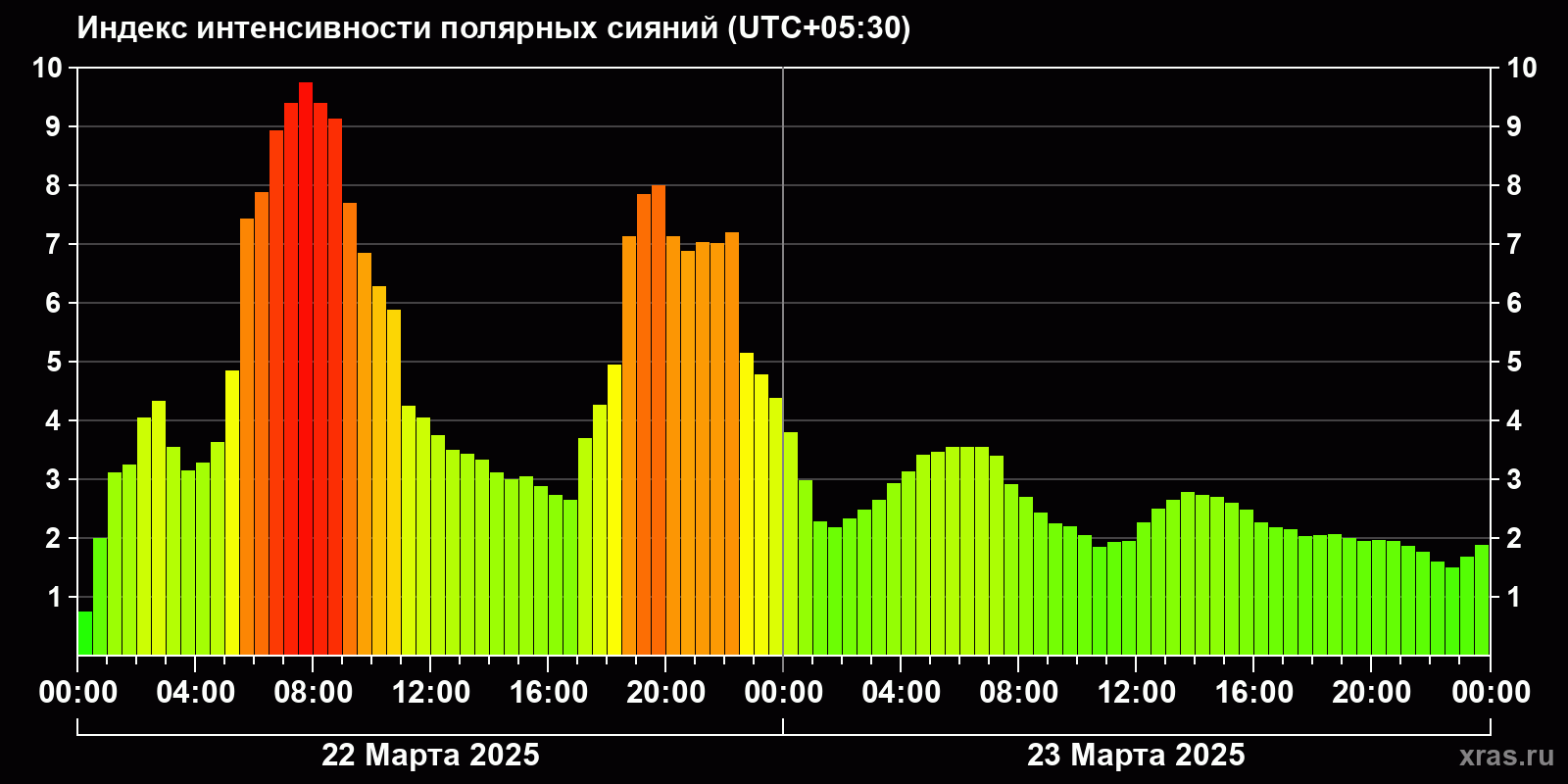 Изменения индекса интенсивности полярных сияний с 2025-03-22 по 2025-03-23 по местному времени