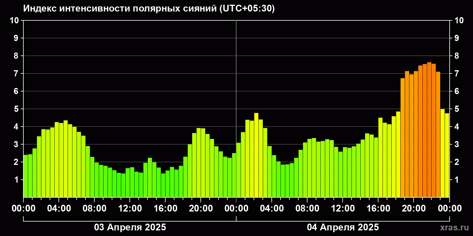 Изменения индекса интенсивности полярных сияний с 2025-04-03 по 2025-04-04 по местному времени