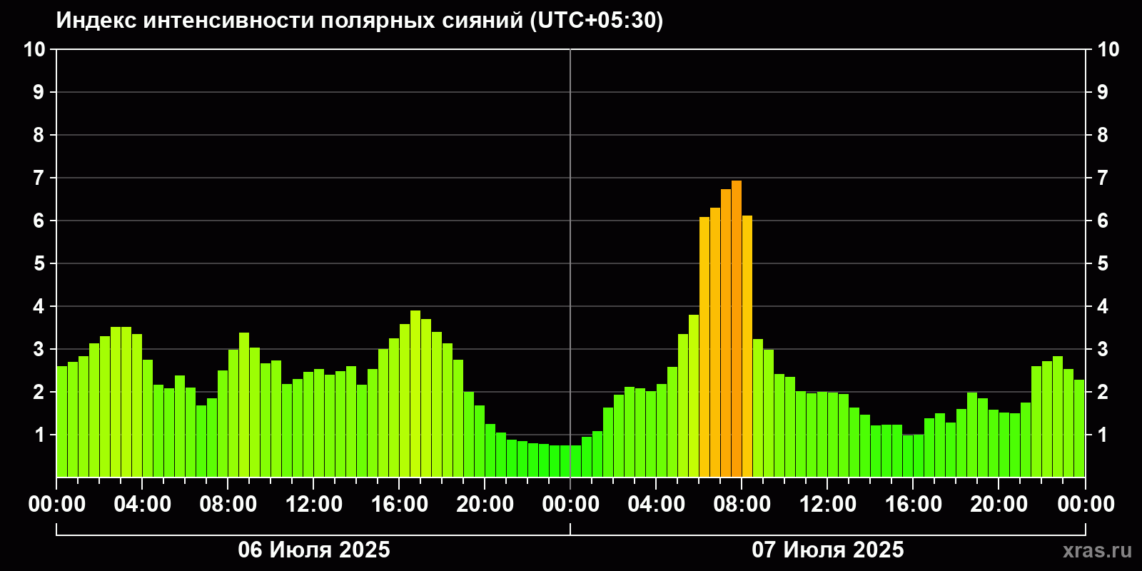 Изменения индекса интенсивности полярных сияний с 2025-07-06 по 2025-07-07 по местному времени