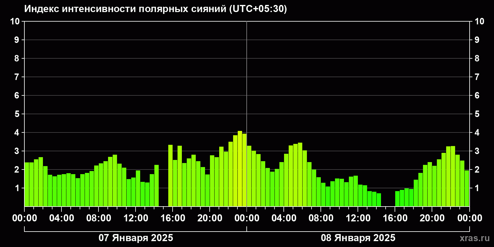 Изменения индекса интенсивности полярных сияний с 2025-01-07 по 2025-01-08 по местному времени