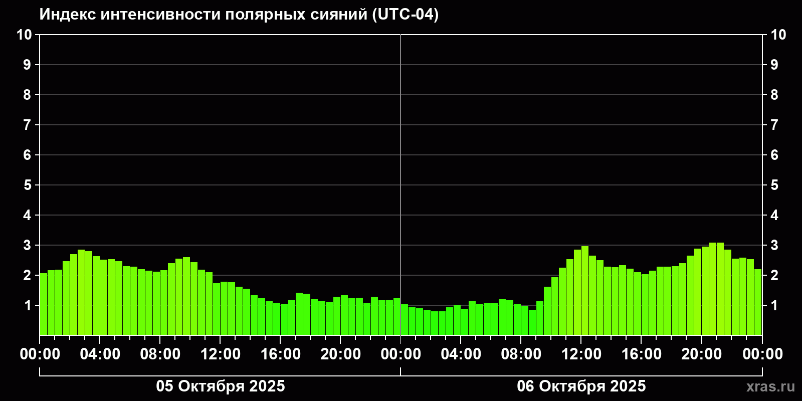 Изменения индекса интенсивности полярных сияний с 2025-10-05 по 2025-10-06 по местному времени