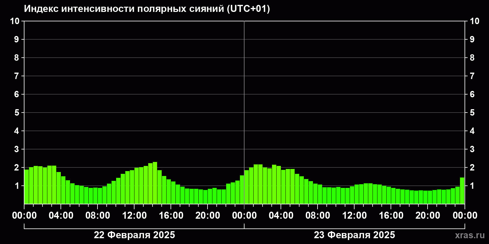 Изменения индекса интенсивности полярных сияний с 2025-02-22 по 2025-02-23 по местному времени