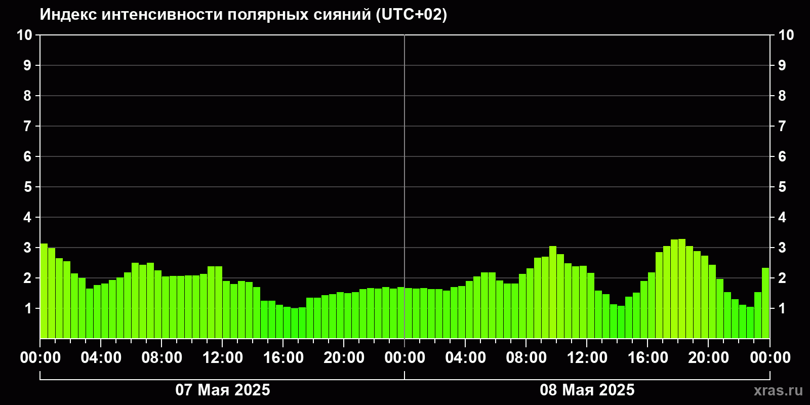 Изменения индекса интенсивности полярных сияний с 2025-05-07 по 2025-05-08 по местному времени