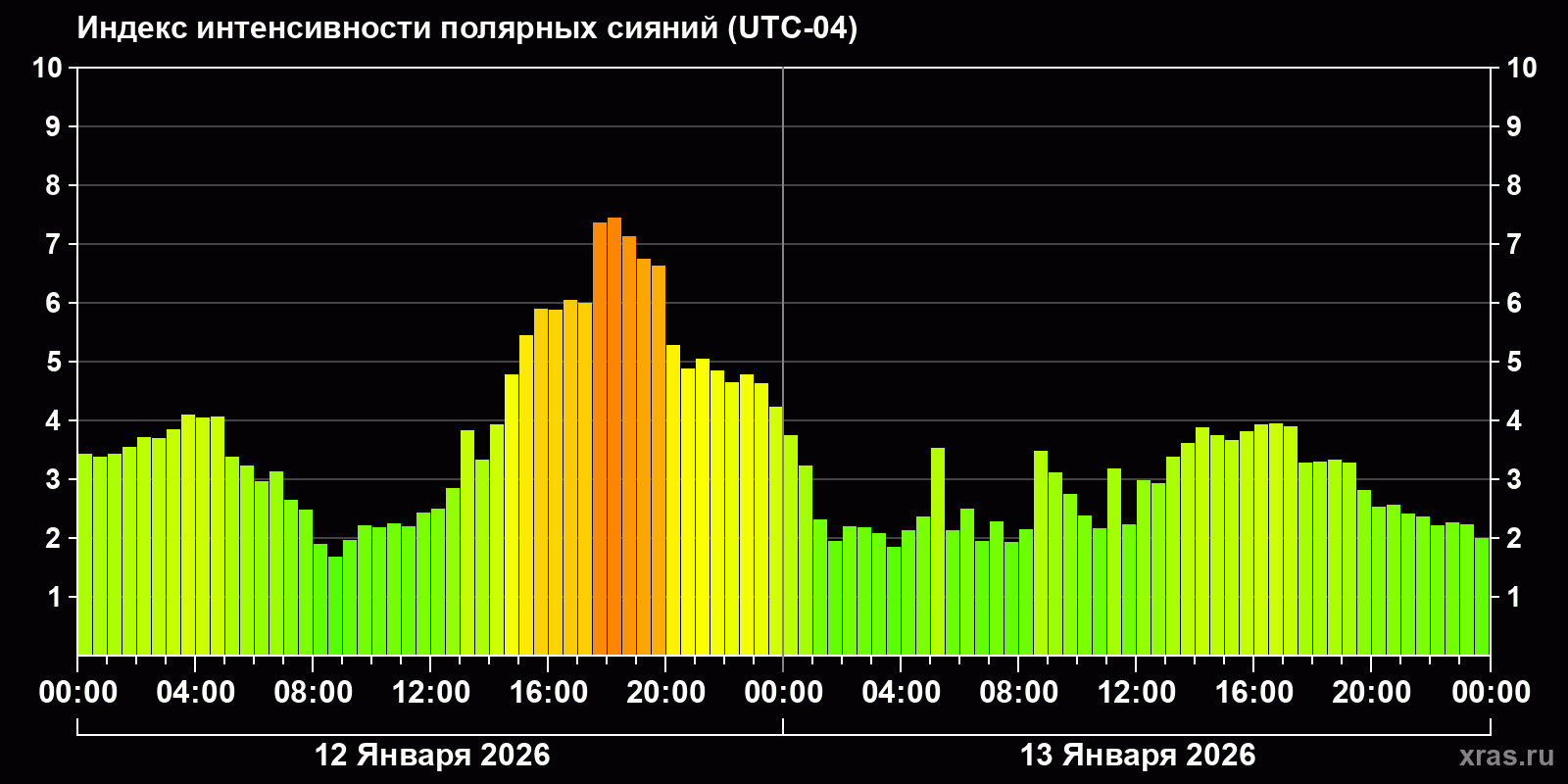 Изменения индекса интенсивности полярных сияний с 2026-01-12 по 2026-01-13 по местному времени