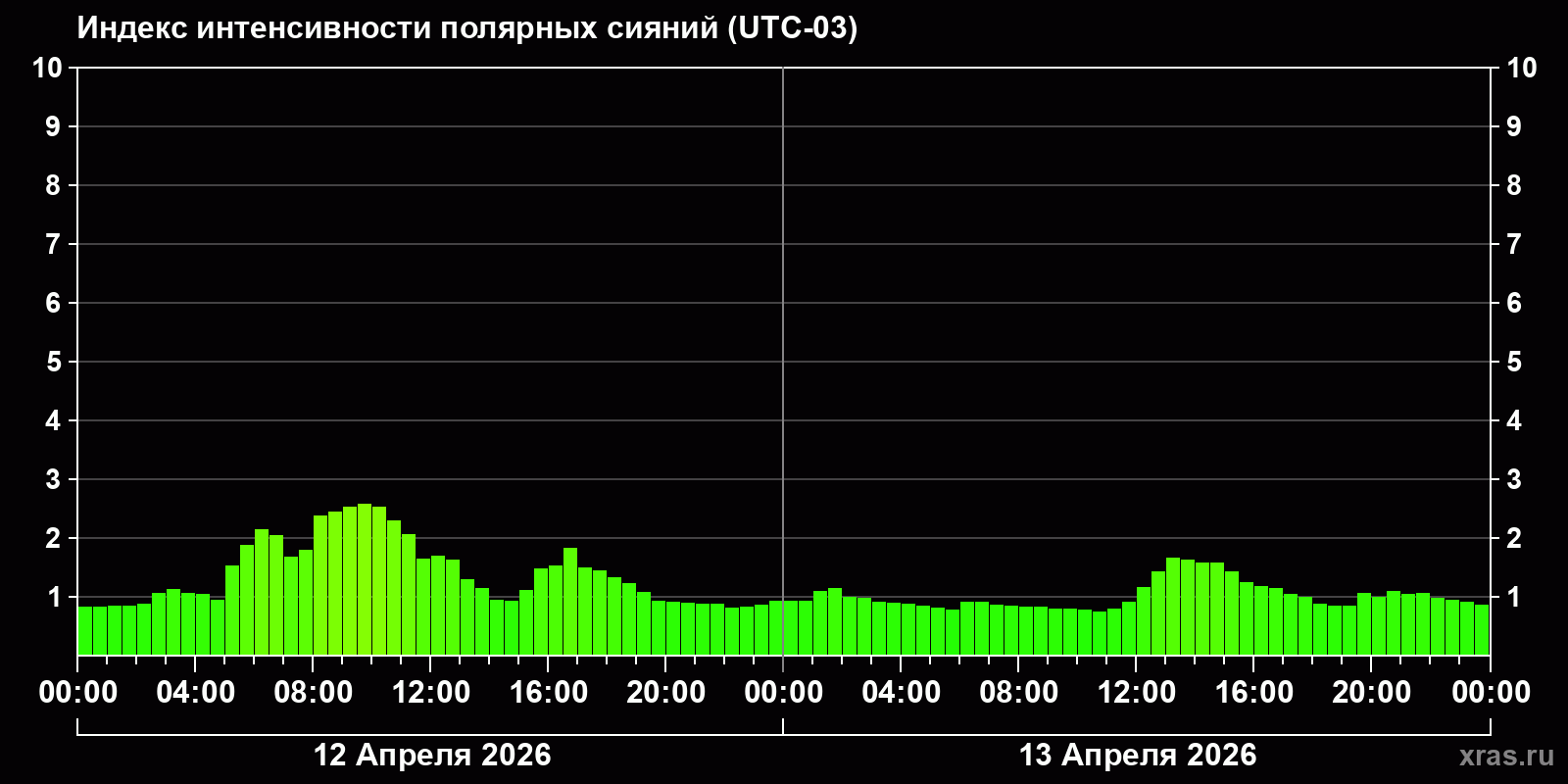 Изменения индекса интенсивности полярных сияний с 2026-04-12 по 2026-04-13 по местному времени