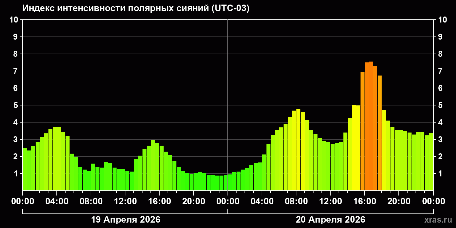 Изменения индекса интенсивности полярных сияний с 2026-04-19 по 2026-04-20 по местному времени