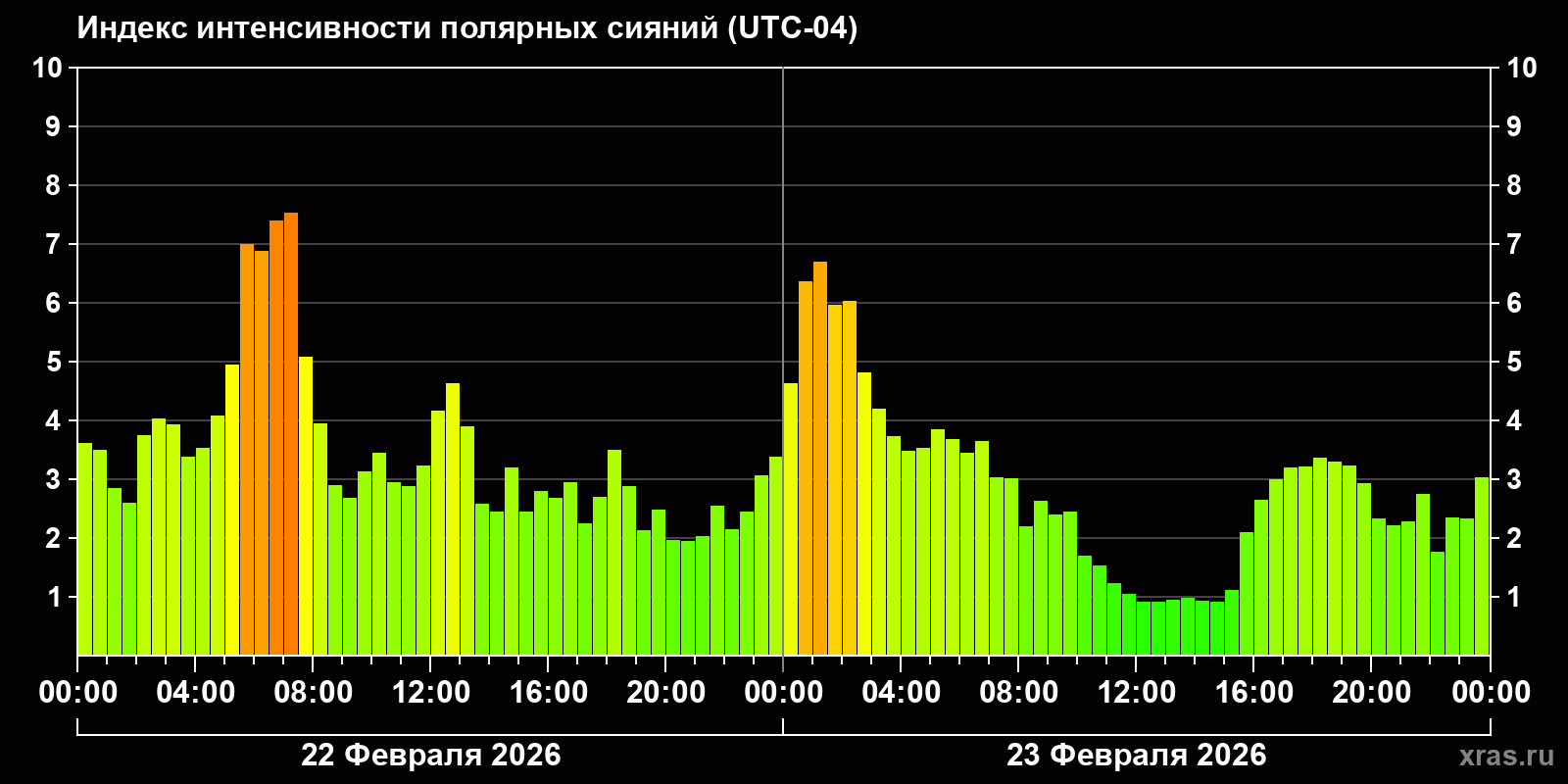 Изменения индекса интенсивности полярных сияний с 2026-02-22 по 2026-02-23 по местному времени