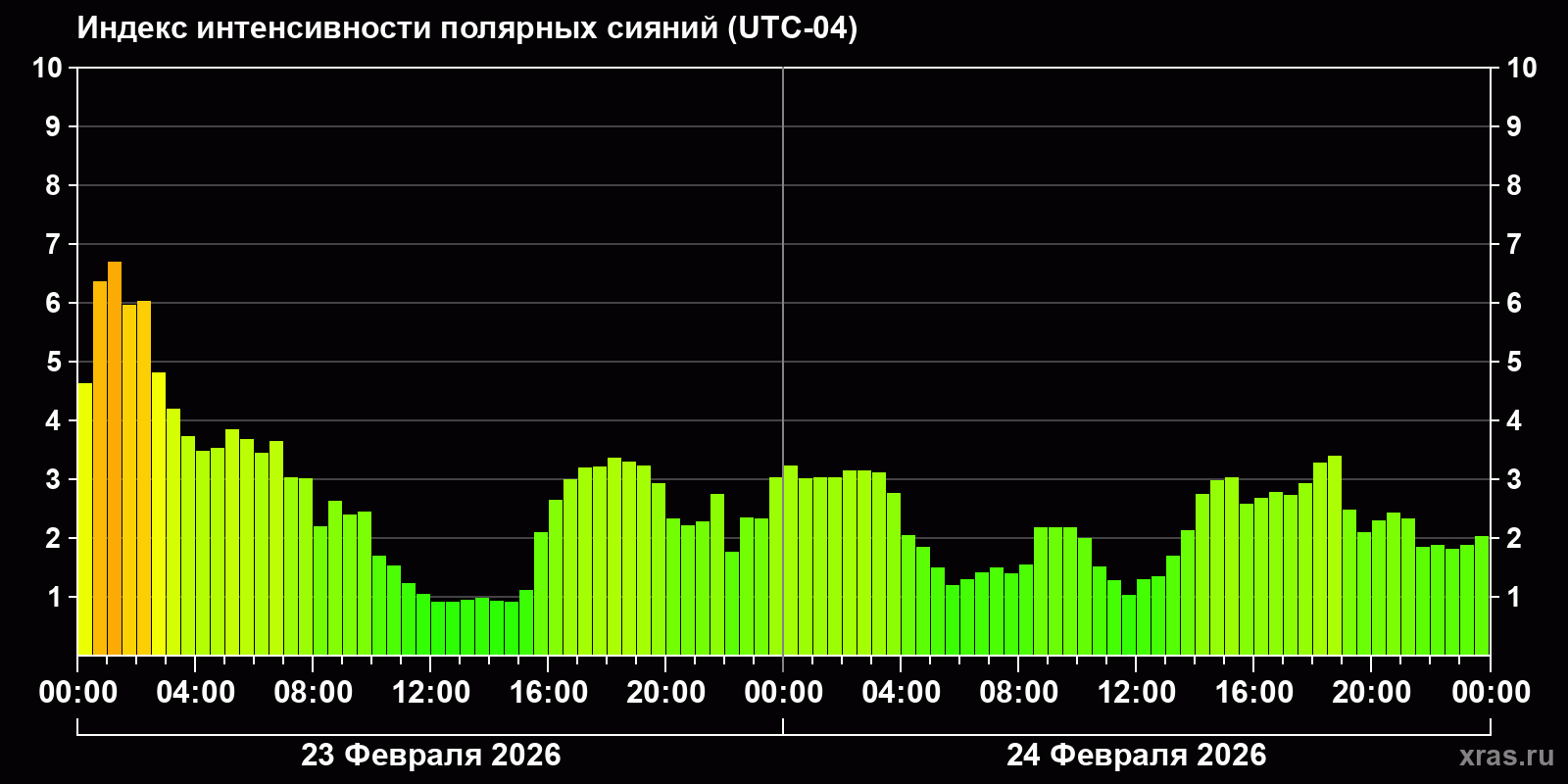 Изменения индекса интенсивности полярных сияний с 2026-02-23 по 2026-02-24 по местному времени
