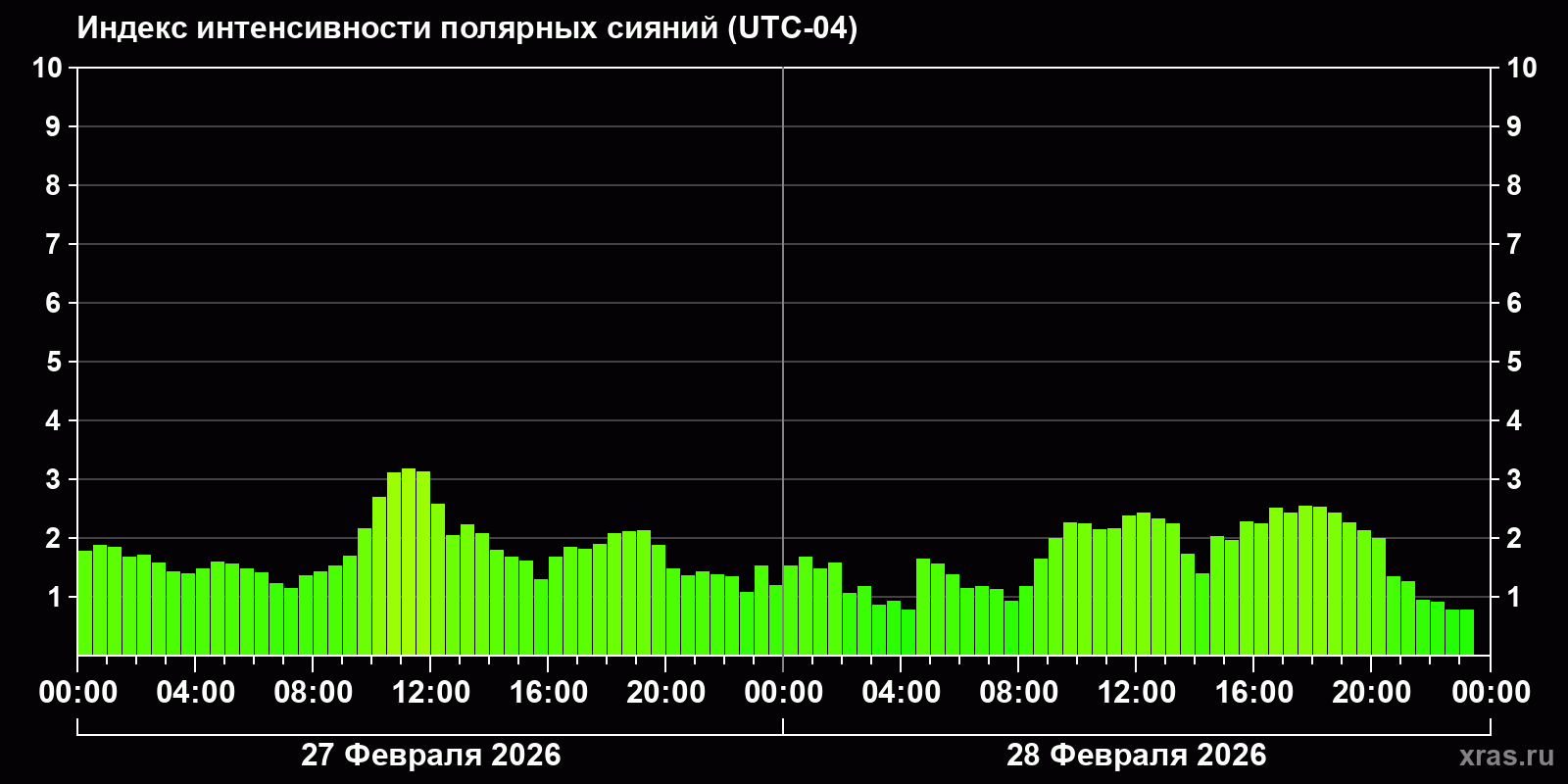 Изменения индекса интенсивности полярных сияний с 2026-02-27 по 2026-02-28 по местному времени