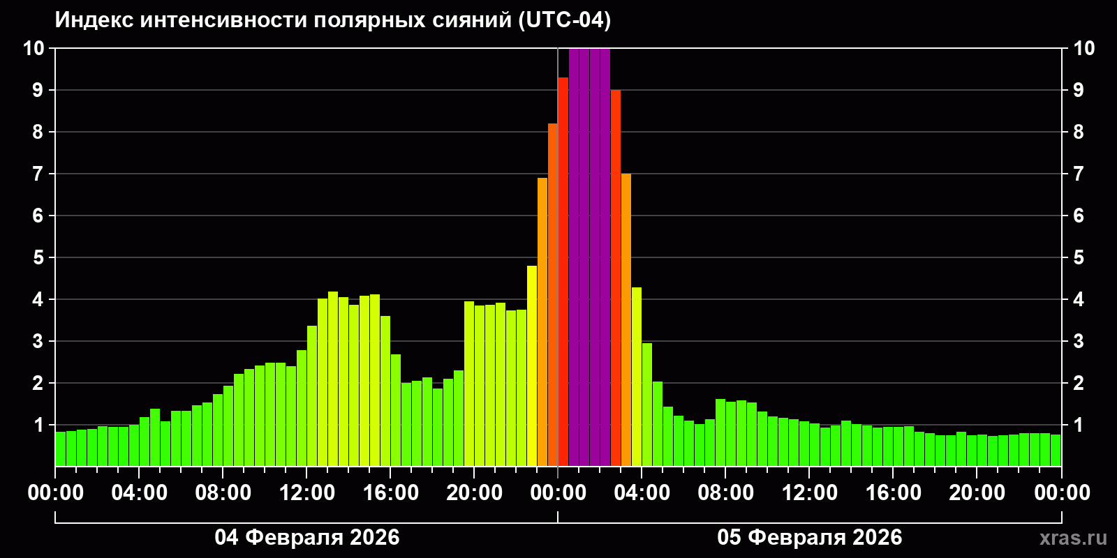 Изменения индекса интенсивности полярных сияний с 2026-02-04 по 2026-02-05 по местному времени