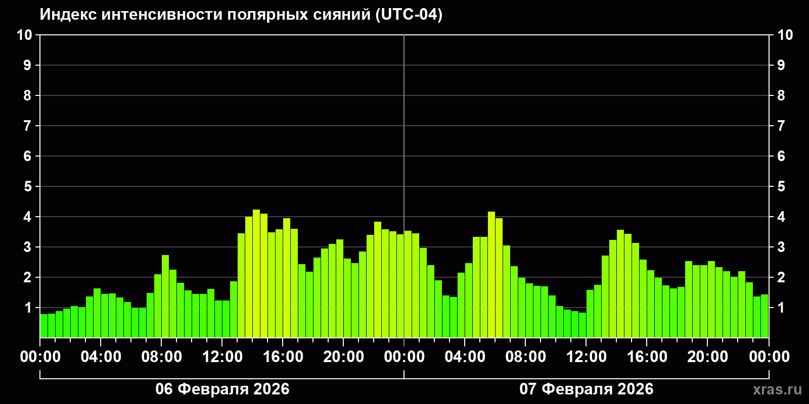 Изменения индекса интенсивности полярных сияний с 2026-02-06 по 2026-02-07 по местному времени