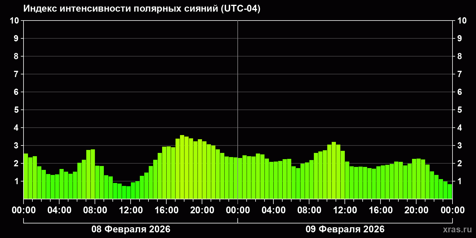 Изменения индекса интенсивности полярных сияний с 2026-02-08 по 2026-02-09 по местному времени