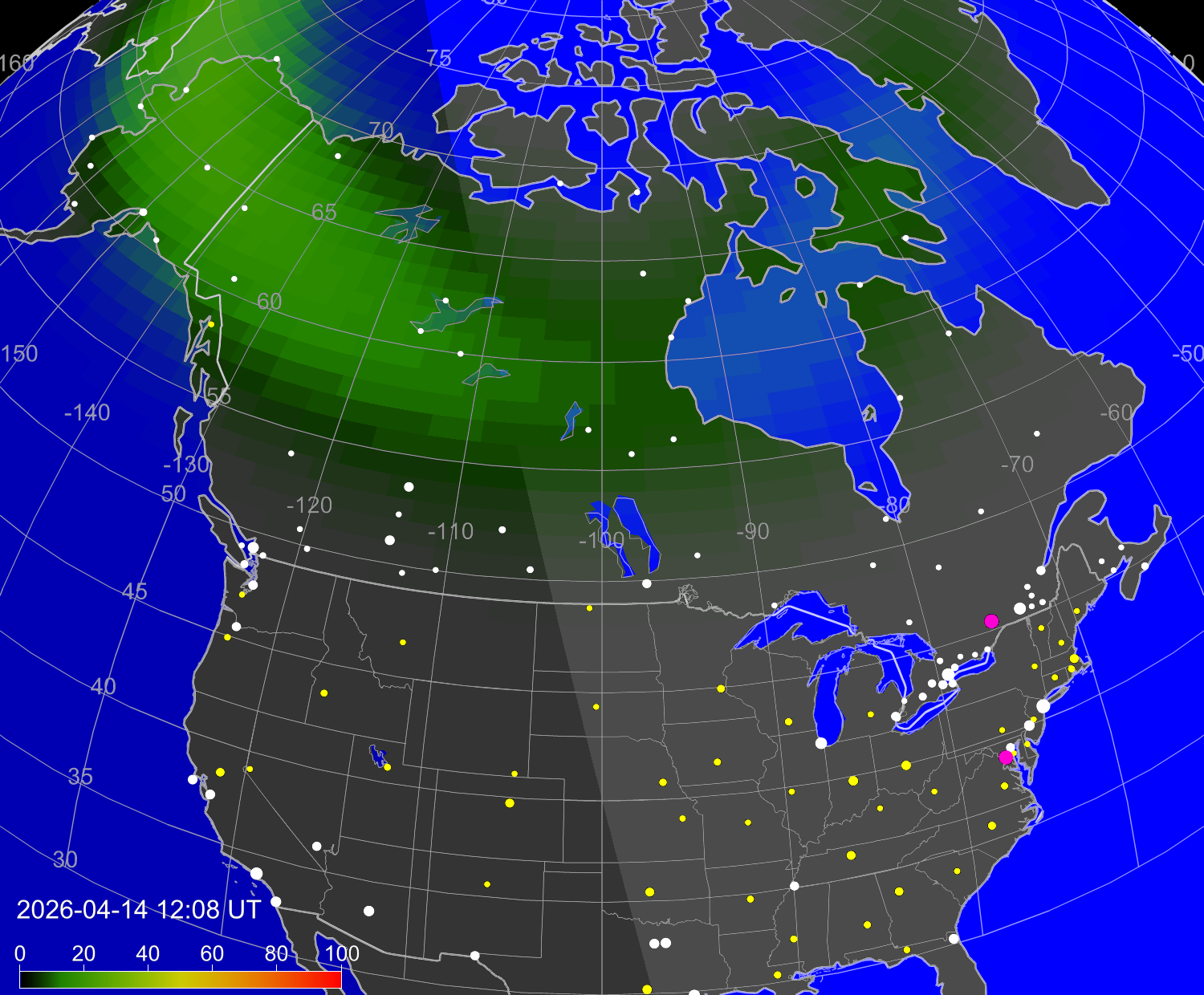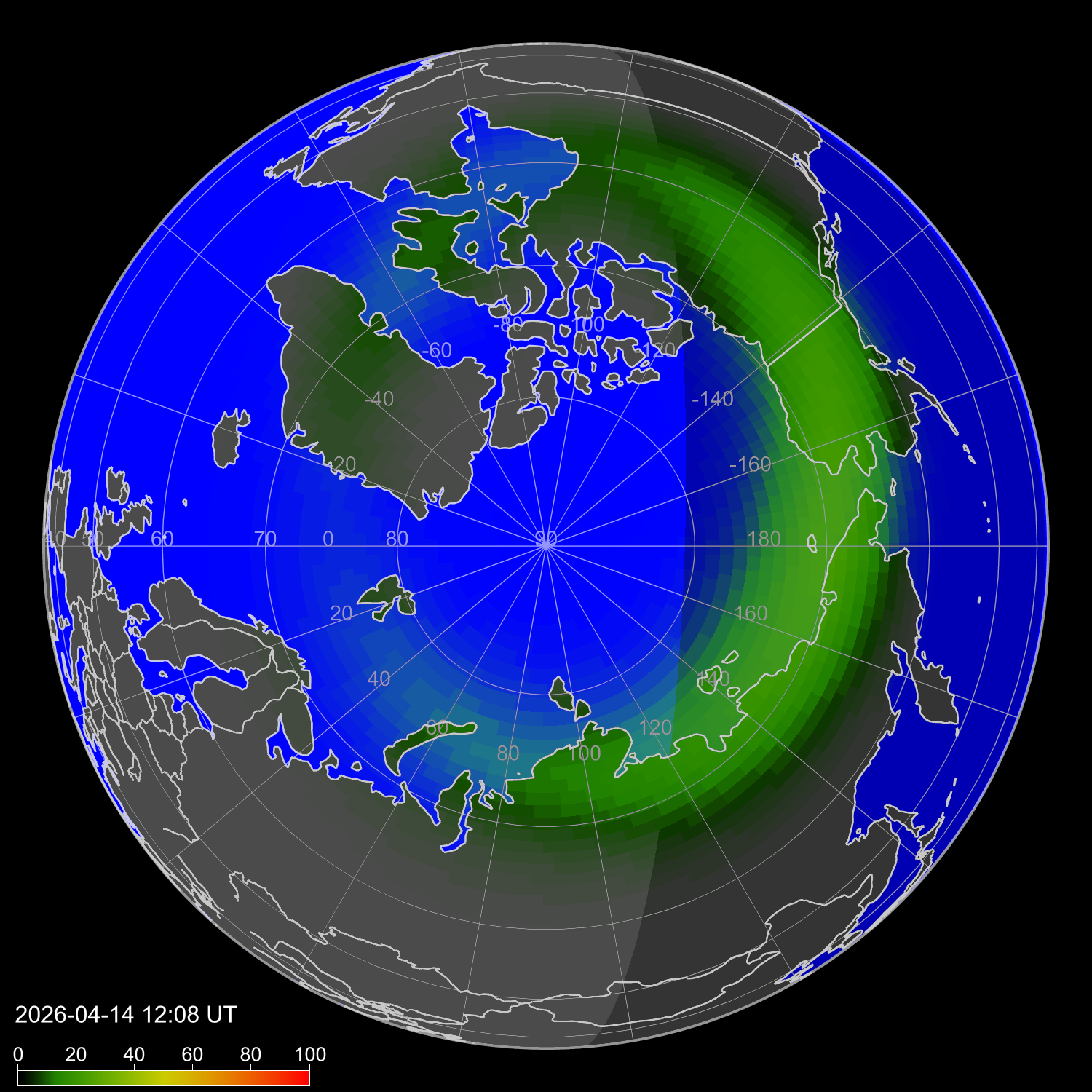 Изменения и часовой прогноз индекса интенсивности полярных сияний с 2026-04-13 по 2026-04-14