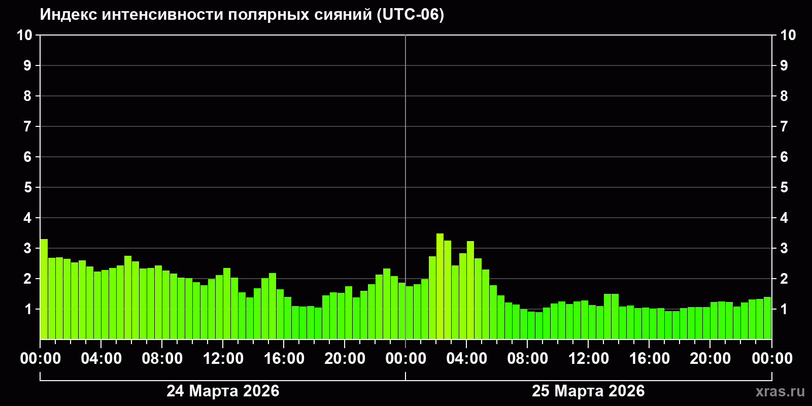 Изменения индекса интенсивности полярных сияний с 2026-03-24 по 2026-03-25 по местному времени