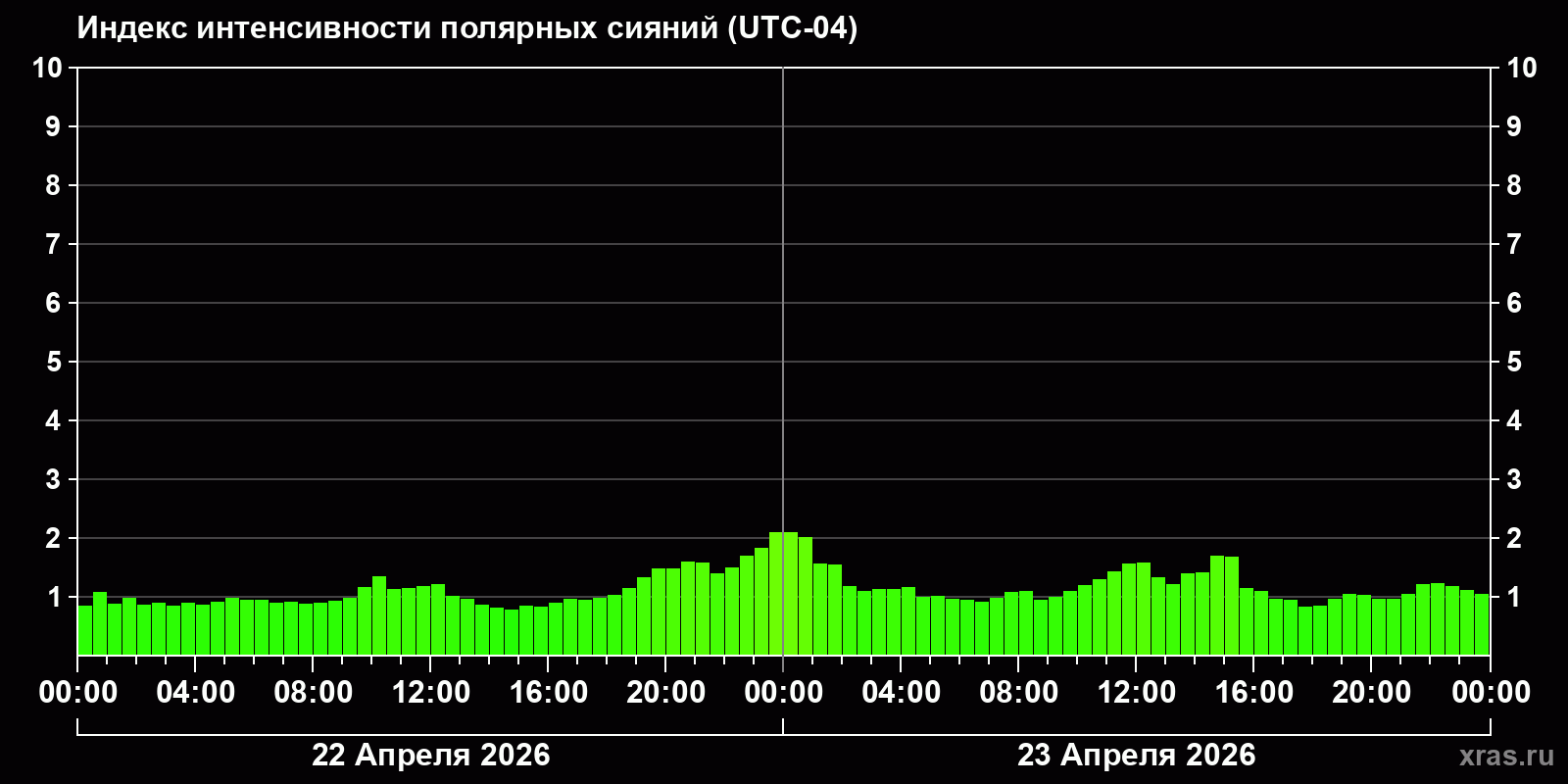 Изменения индекса интенсивности полярных сияний с 2026-04-22 по 2026-04-23 по местному времени