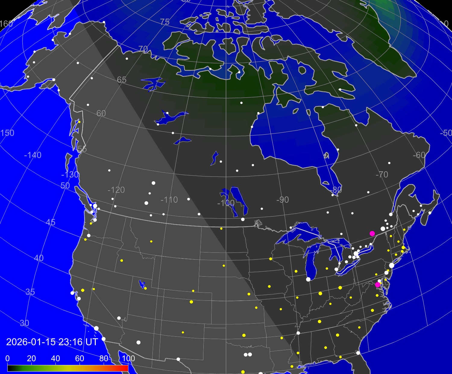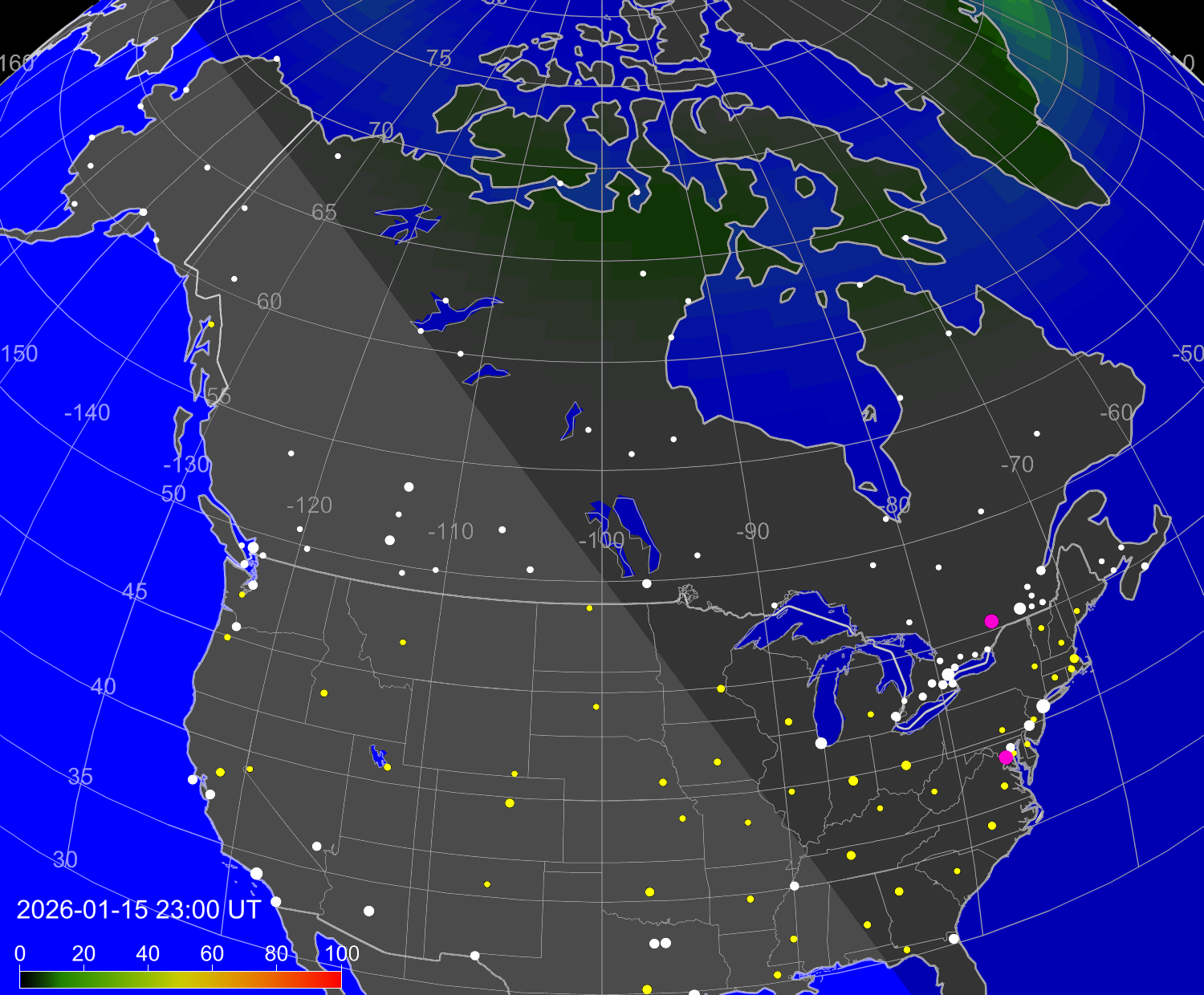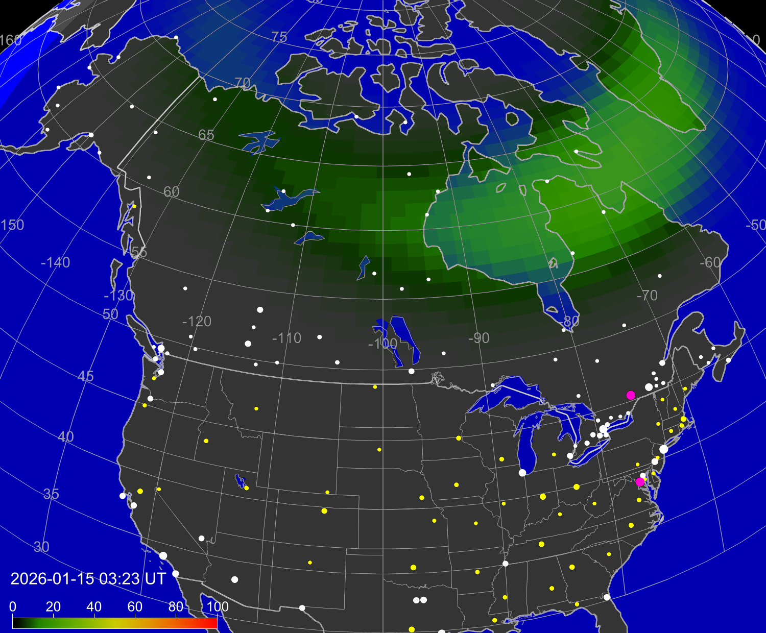 Индекс интенсивности полярных сияний и теоретически возможная широта наблюдений для ночного времени в западном полушарии
