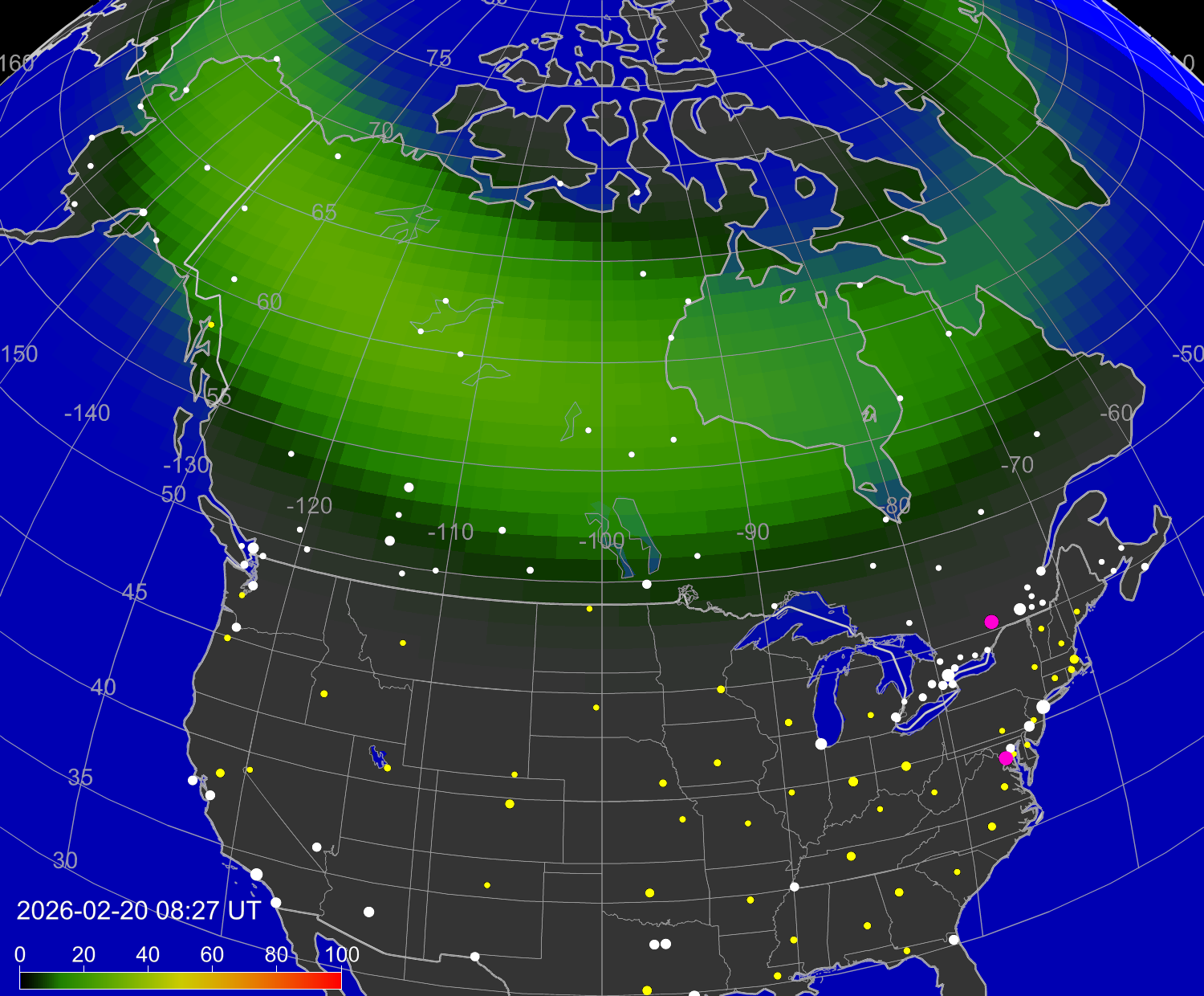 Изменения и часовой прогноз индекса интенсивности полярных сияний с 2026-02-18 по 2026-02-19