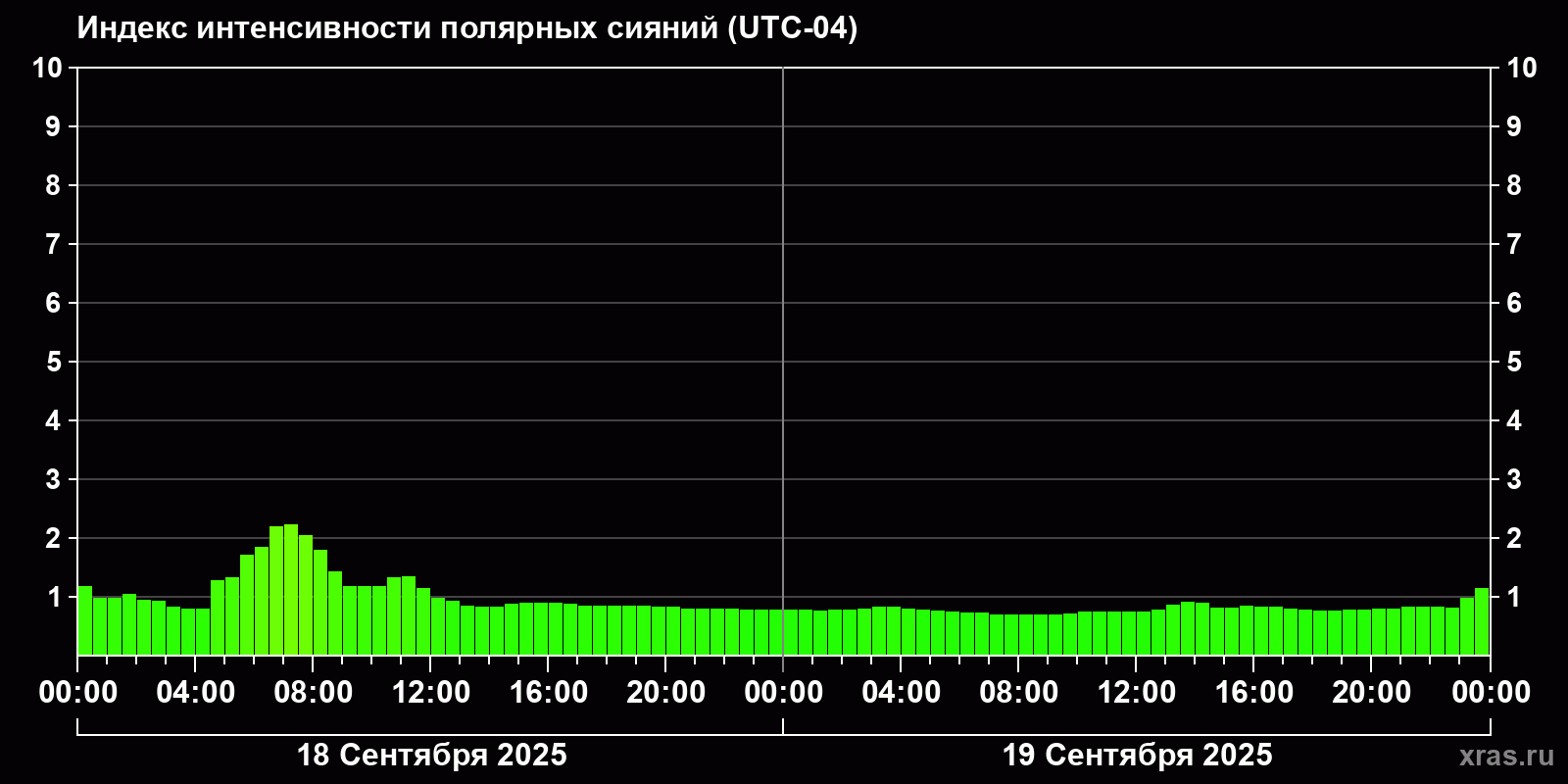 Изменения индекса интенсивности полярных сияний с 2025-09-18 по 2025-09-19 по местному времени