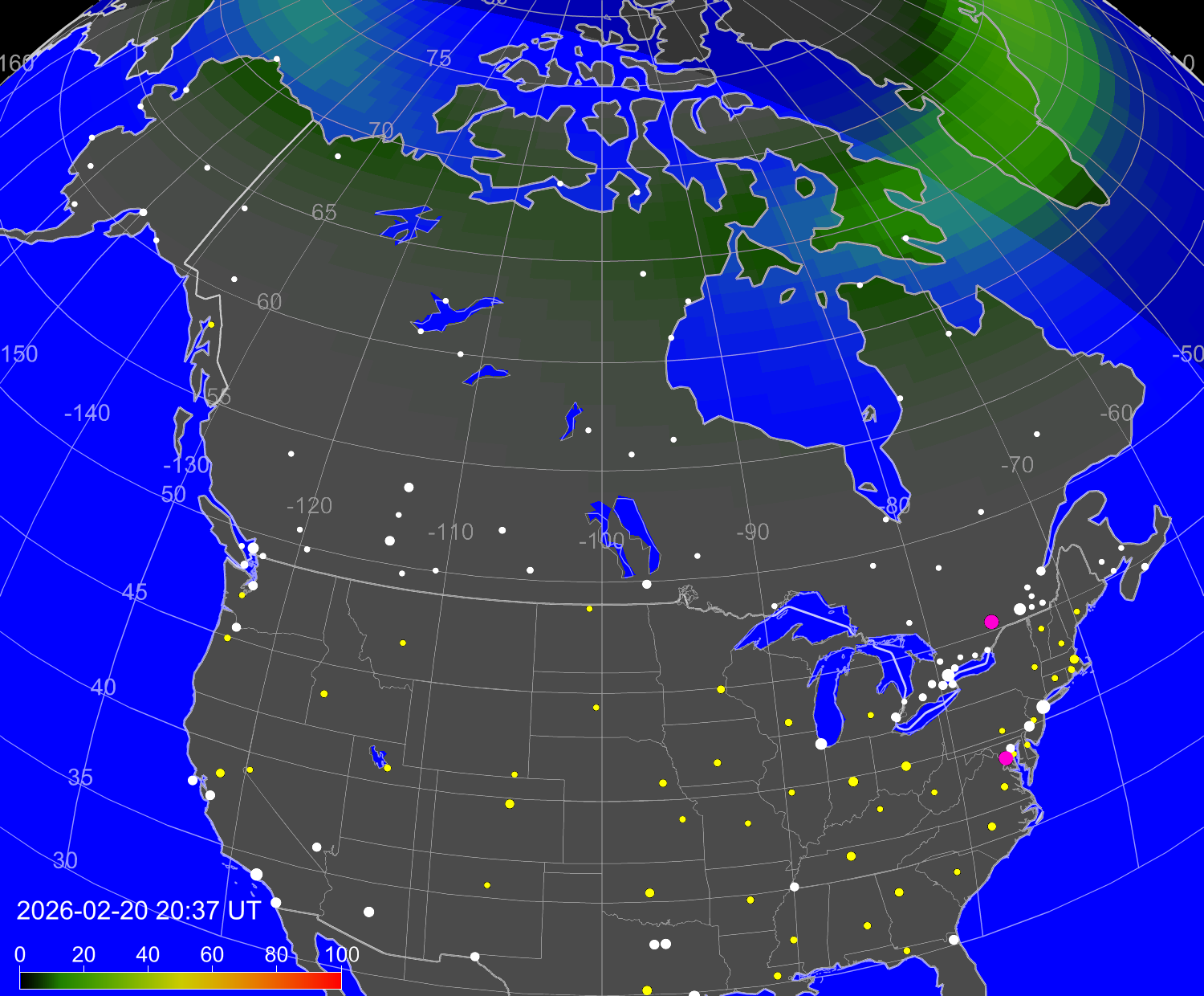 Индекс интенсивности полярных сияний и теоретически возможная широта наблюдений для ночного времени в западном полушарии