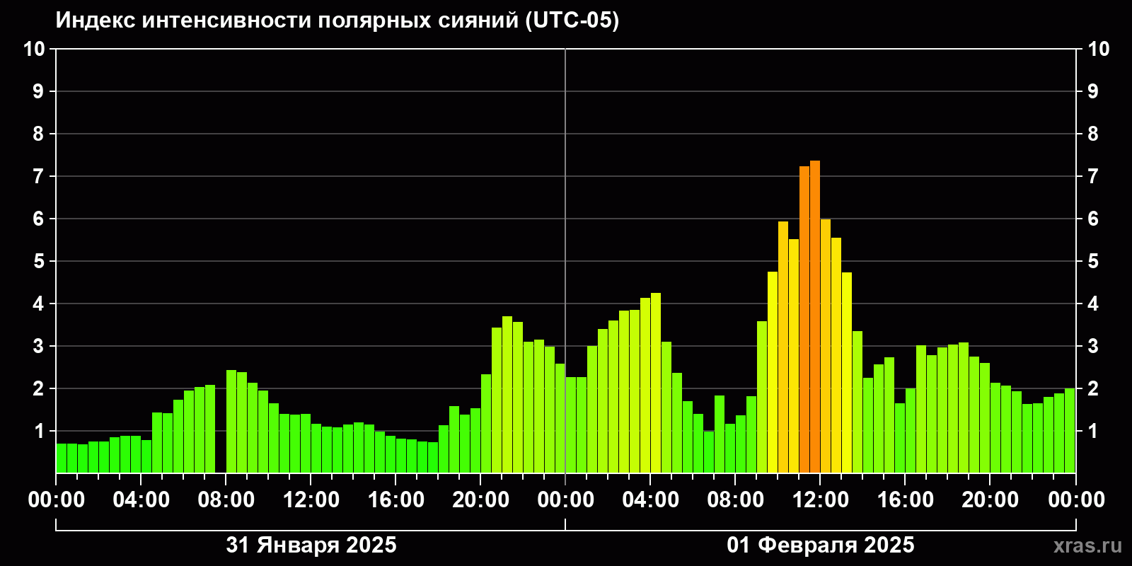 Изменения индекса интенсивности полярных сияний с 2025-01-31 по 2025-02-01 по местному времени