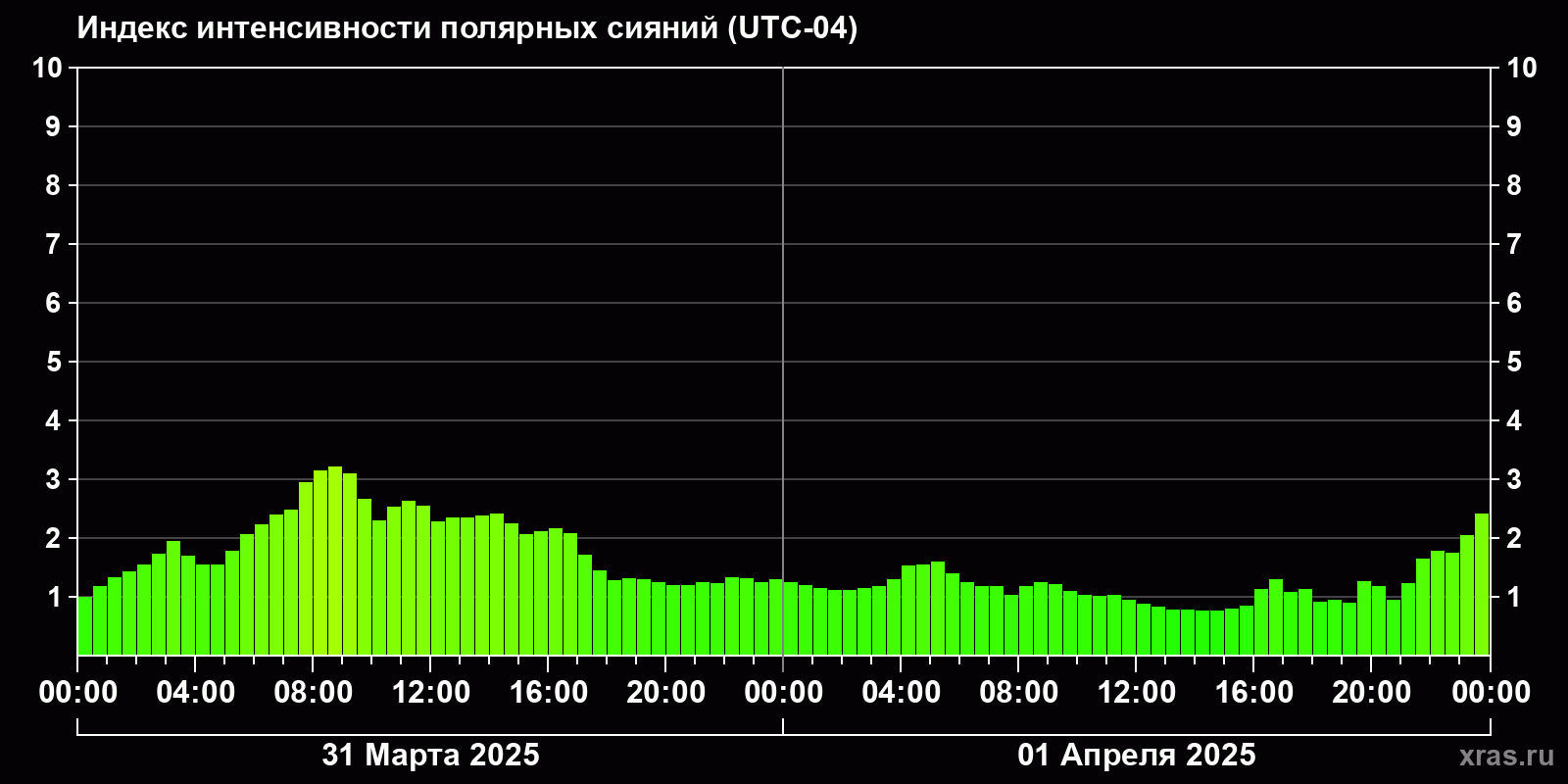 Изменения индекса интенсивности полярных сияний с 2025-03-31 по 2025-04-01 по местному времени