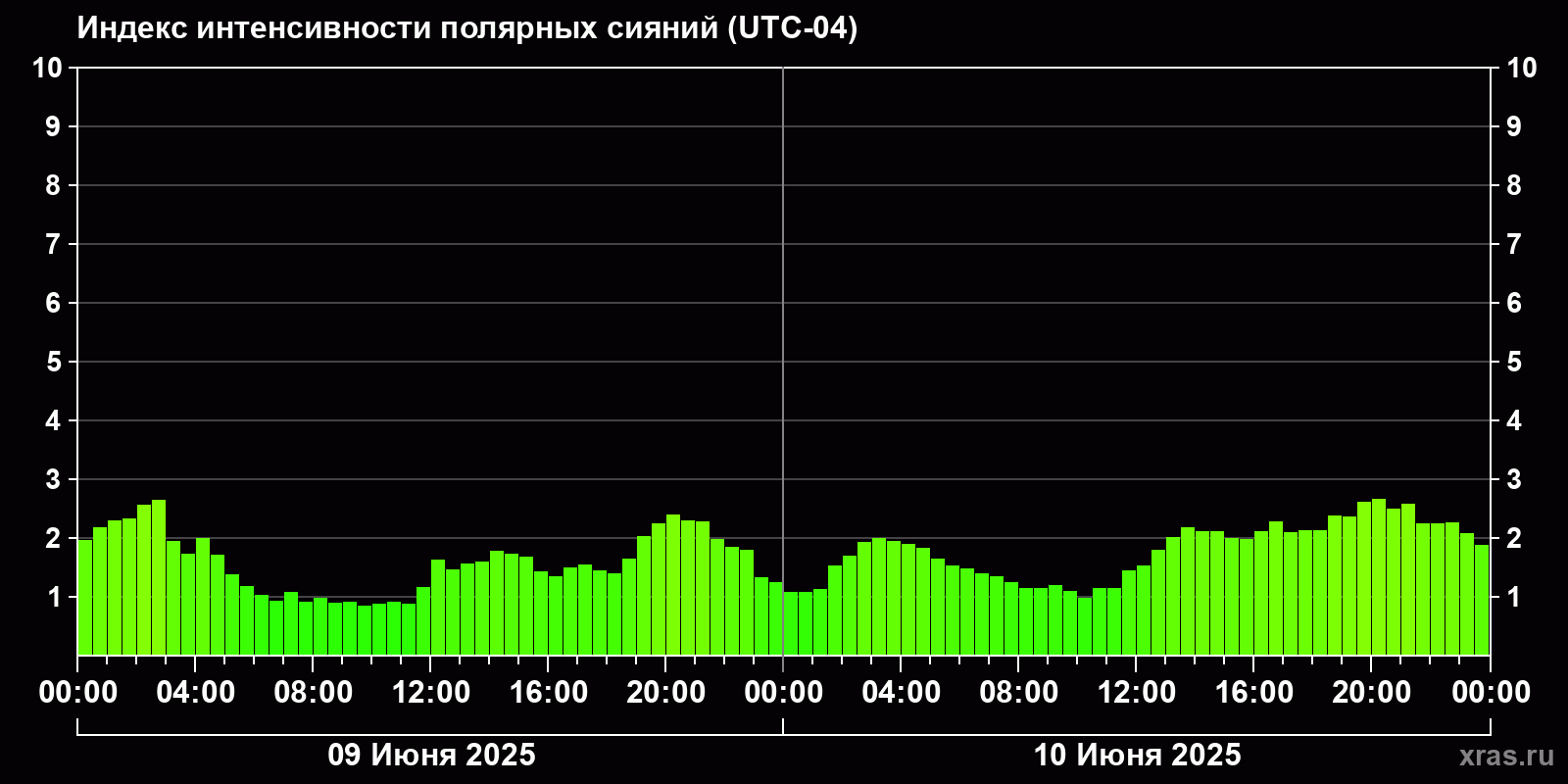 Изменения индекса интенсивности полярных сияний с 2025-06-09 по 2025-06-10 по местному времени