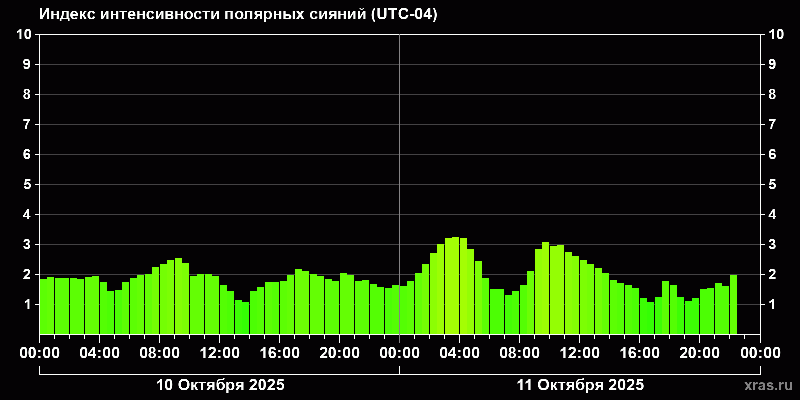 Изменения индекса интенсивности полярных сияний с 2025-10-10 по 2025-10-11 по местному времени