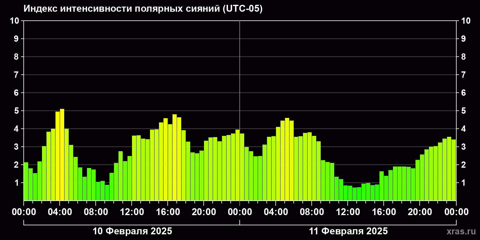 Изменения индекса интенсивности полярных сияний с 2025-02-10 по 2025-02-11 по местному времени
