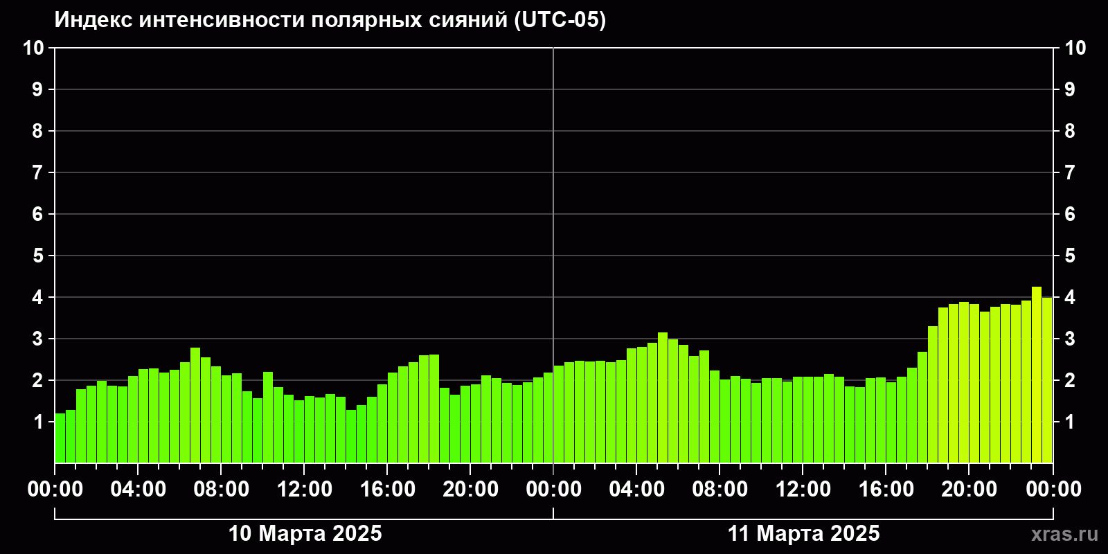 Изменения индекса интенсивности полярных сияний с 2025-03-10 по 2025-03-11 по местному времени