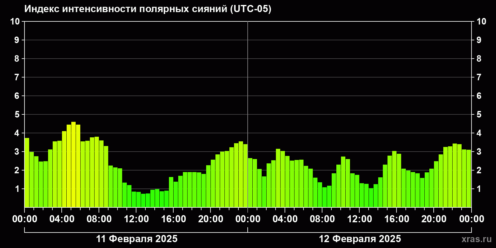 Изменения индекса интенсивности полярных сияний с 2025-02-11 по 2025-02-12 по местному времени