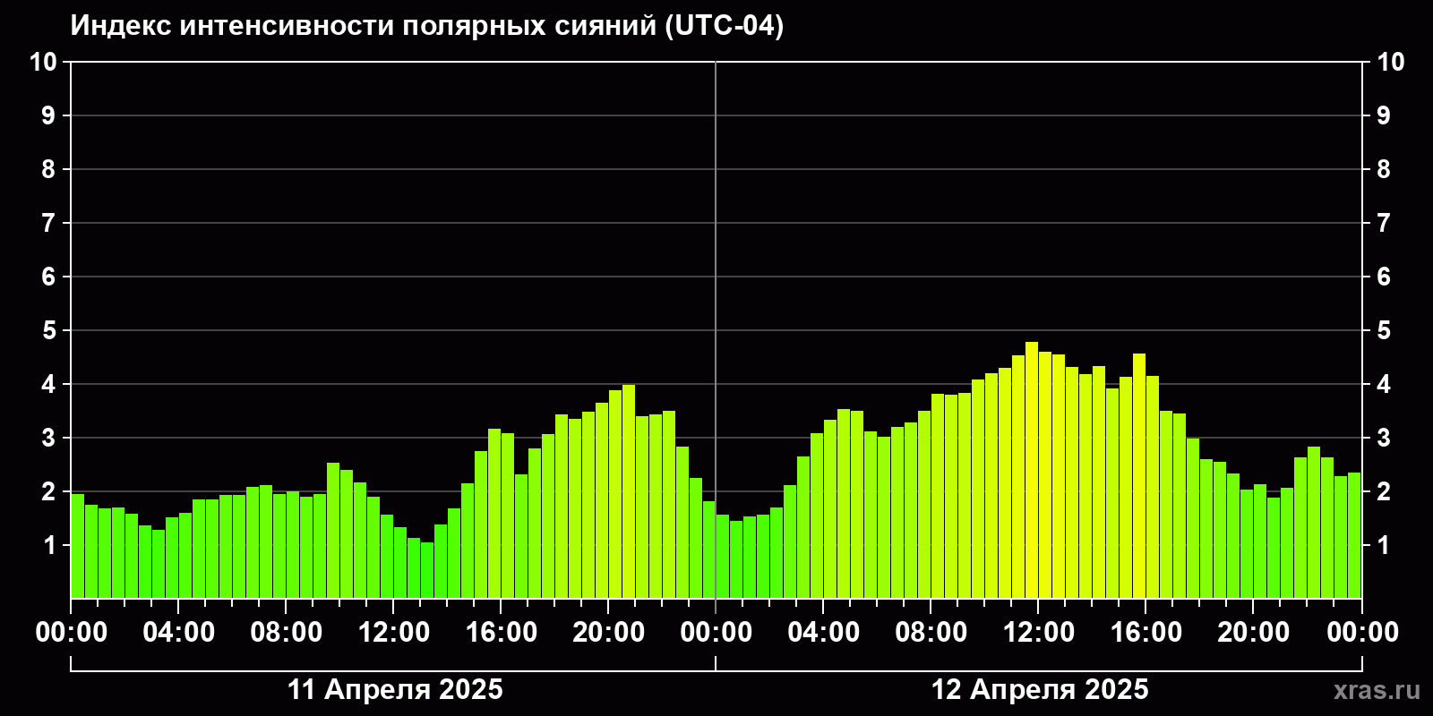 Изменения индекса интенсивности полярных сияний с 2025-04-11 по 2025-04-12 по местному времени