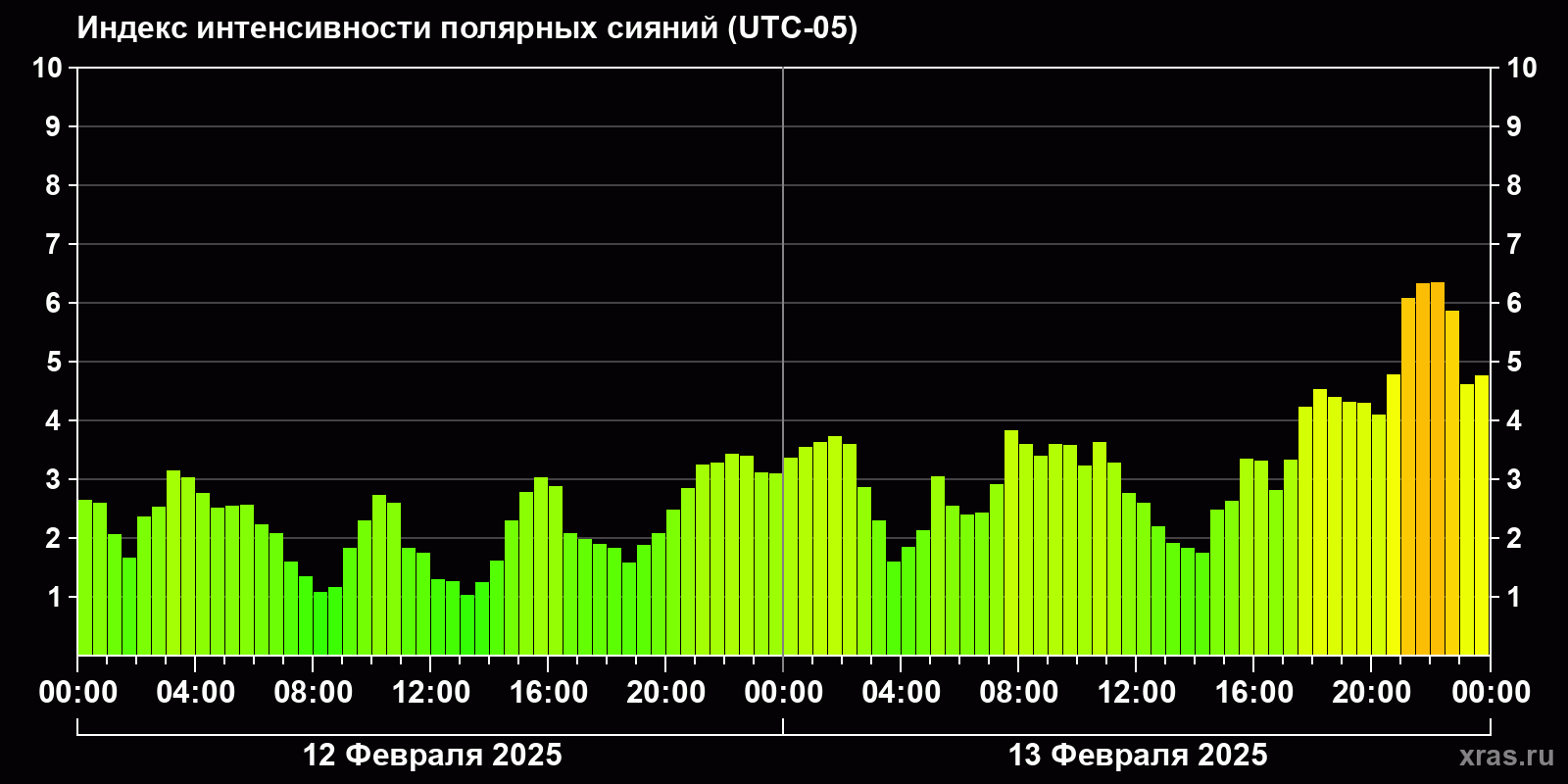Изменения индекса интенсивности полярных сияний с 2025-02-12 по 2025-02-13 по местному времени