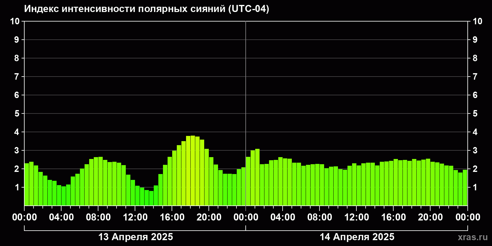 Изменения индекса интенсивности полярных сияний с 2025-04-13 по 2025-04-14 по местному времени