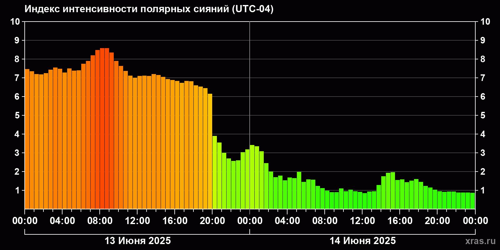 Изменения индекса интенсивности полярных сияний с 2025-06-13 по 2025-06-14 по местному времени