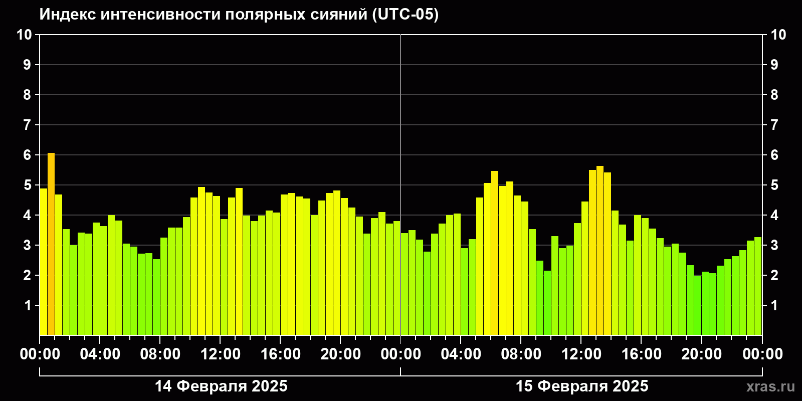 Изменения индекса интенсивности полярных сияний с 2025-02-14 по 2025-02-15 по местному времени