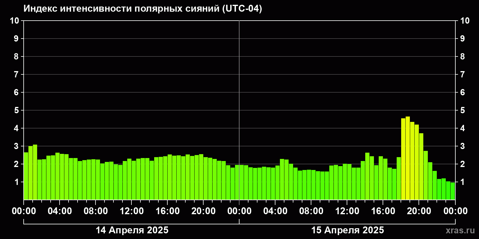 Изменения индекса интенсивности полярных сияний с 2025-04-14 по 2025-04-15 по местному времени