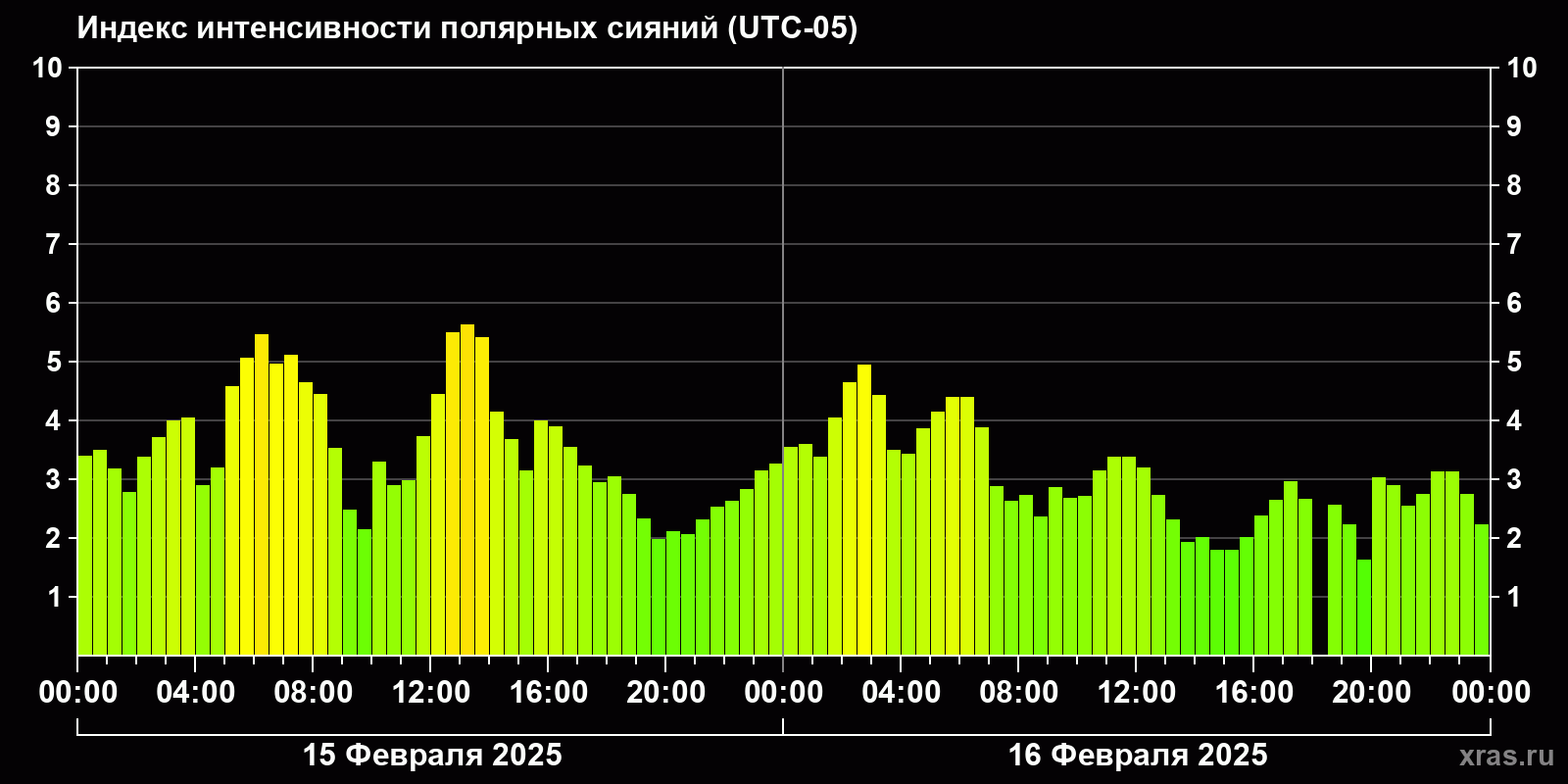Изменения индекса интенсивности полярных сияний с 2025-02-15 по 2025-02-16 по местному времени