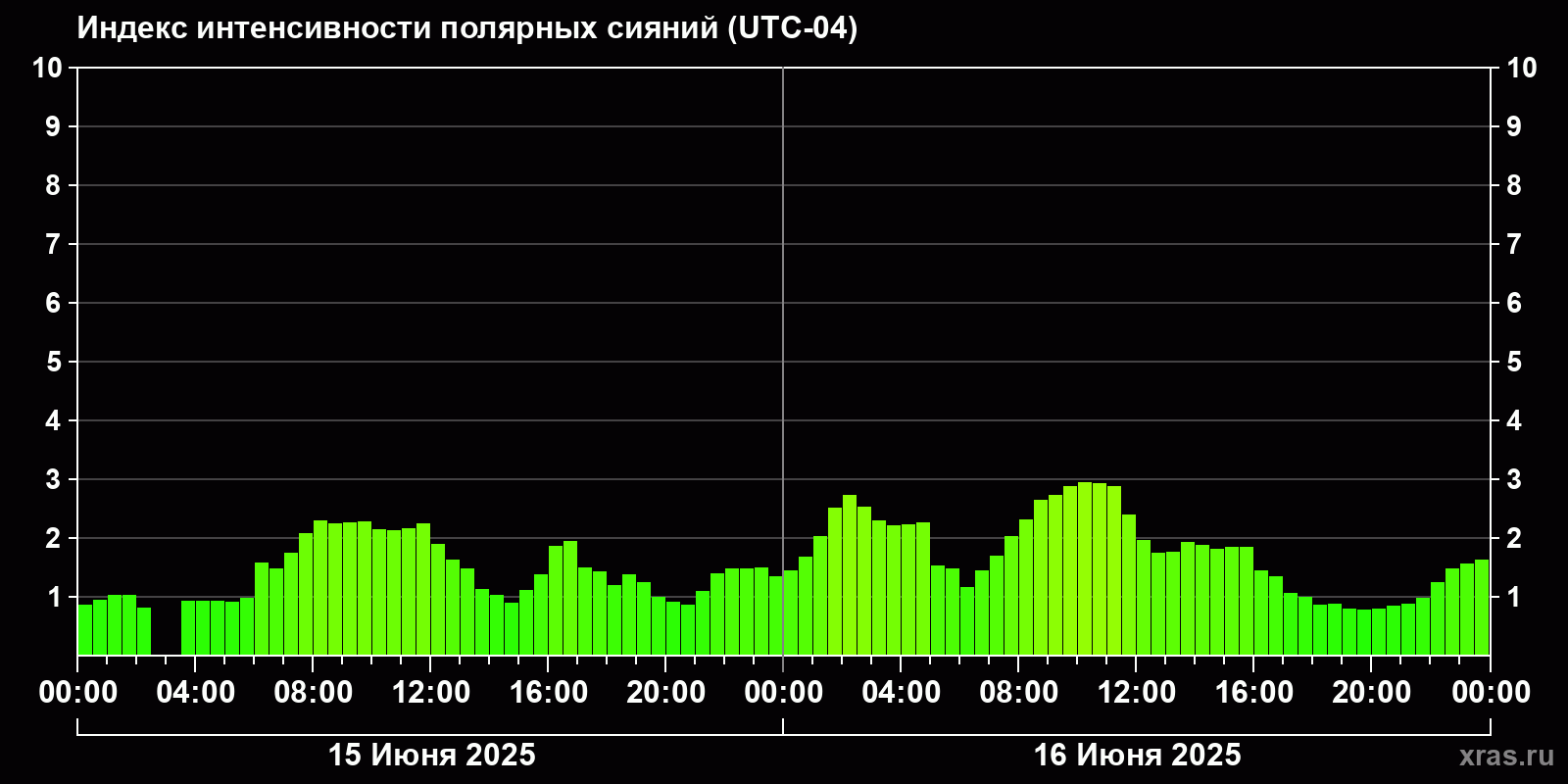Изменения индекса интенсивности полярных сияний с 2025-06-15 по 2025-06-16 по местному времени