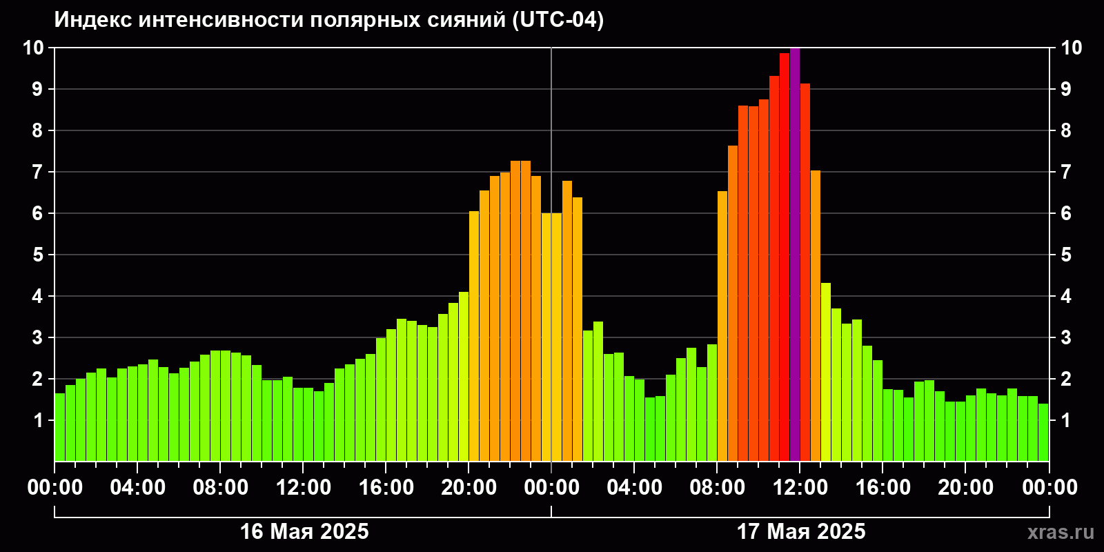 Изменения индекса интенсивности полярных сияний с 2025-05-16 по 2025-05-17 по местному времени