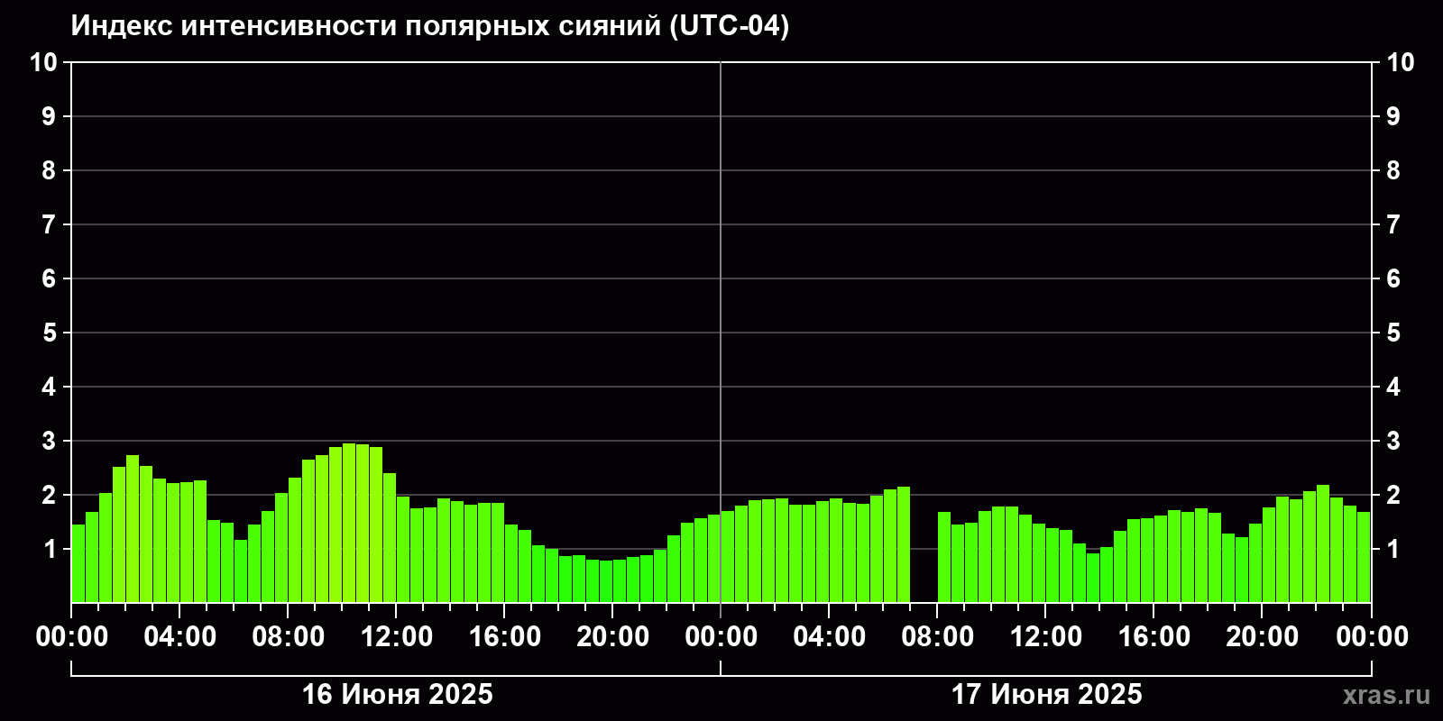 Изменения индекса интенсивности полярных сияний с 2025-06-16 по 2025-06-17 по местному времени