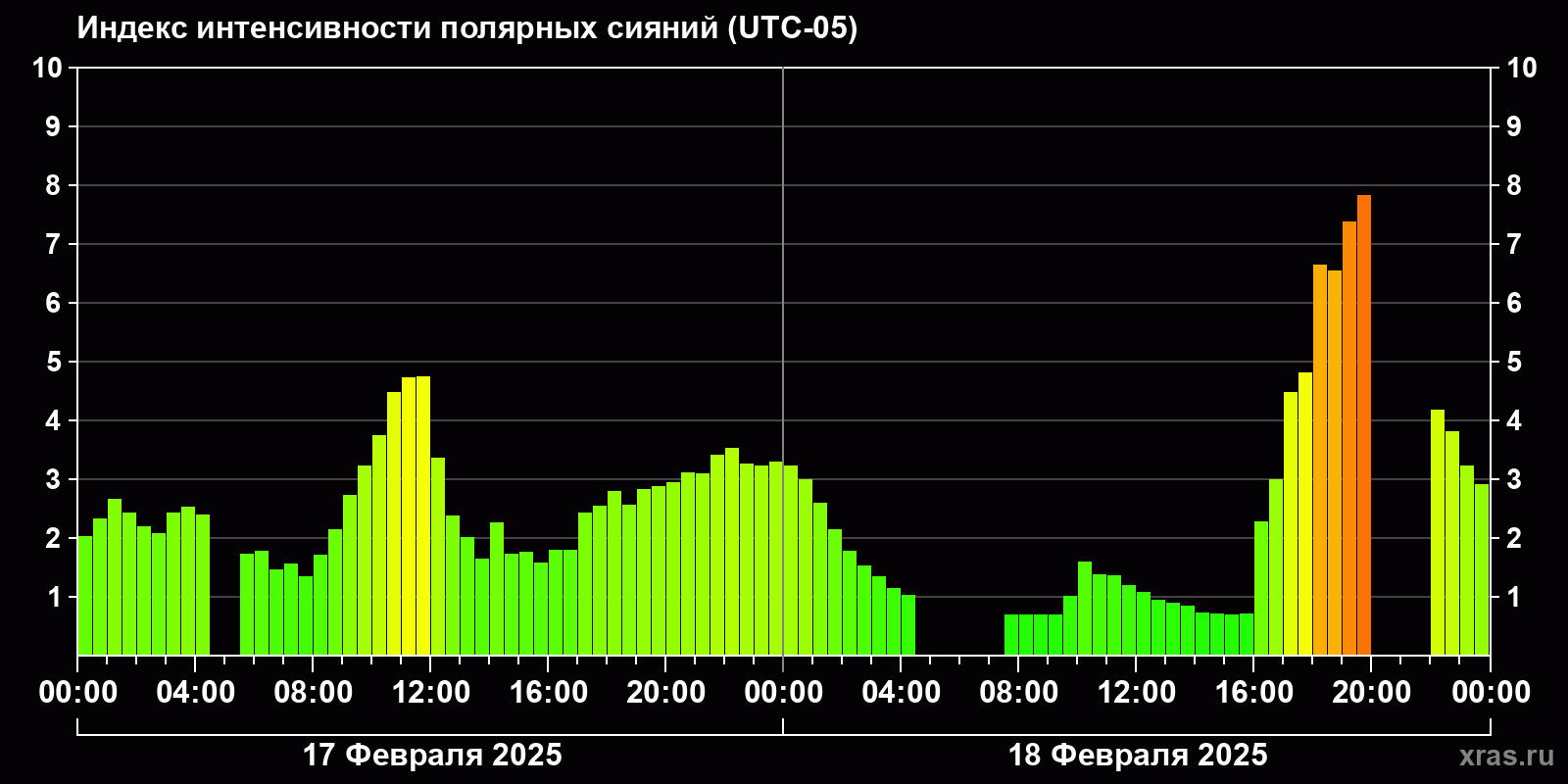 Изменения индекса интенсивности полярных сияний с 2025-02-17 по 2025-02-18 по местному времени
