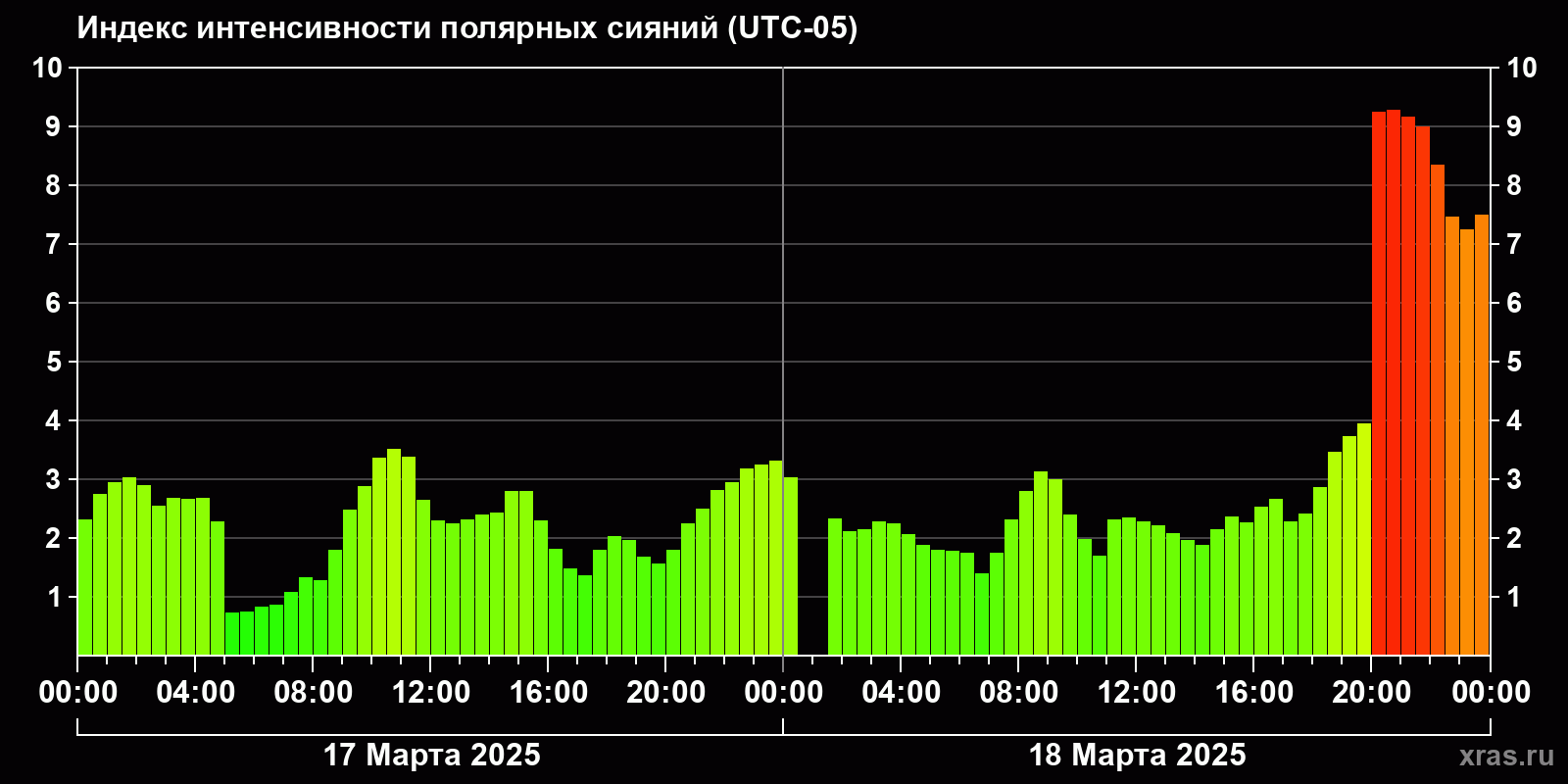 Изменения индекса интенсивности полярных сияний с 2025-03-17 по 2025-03-18 по местному времени
