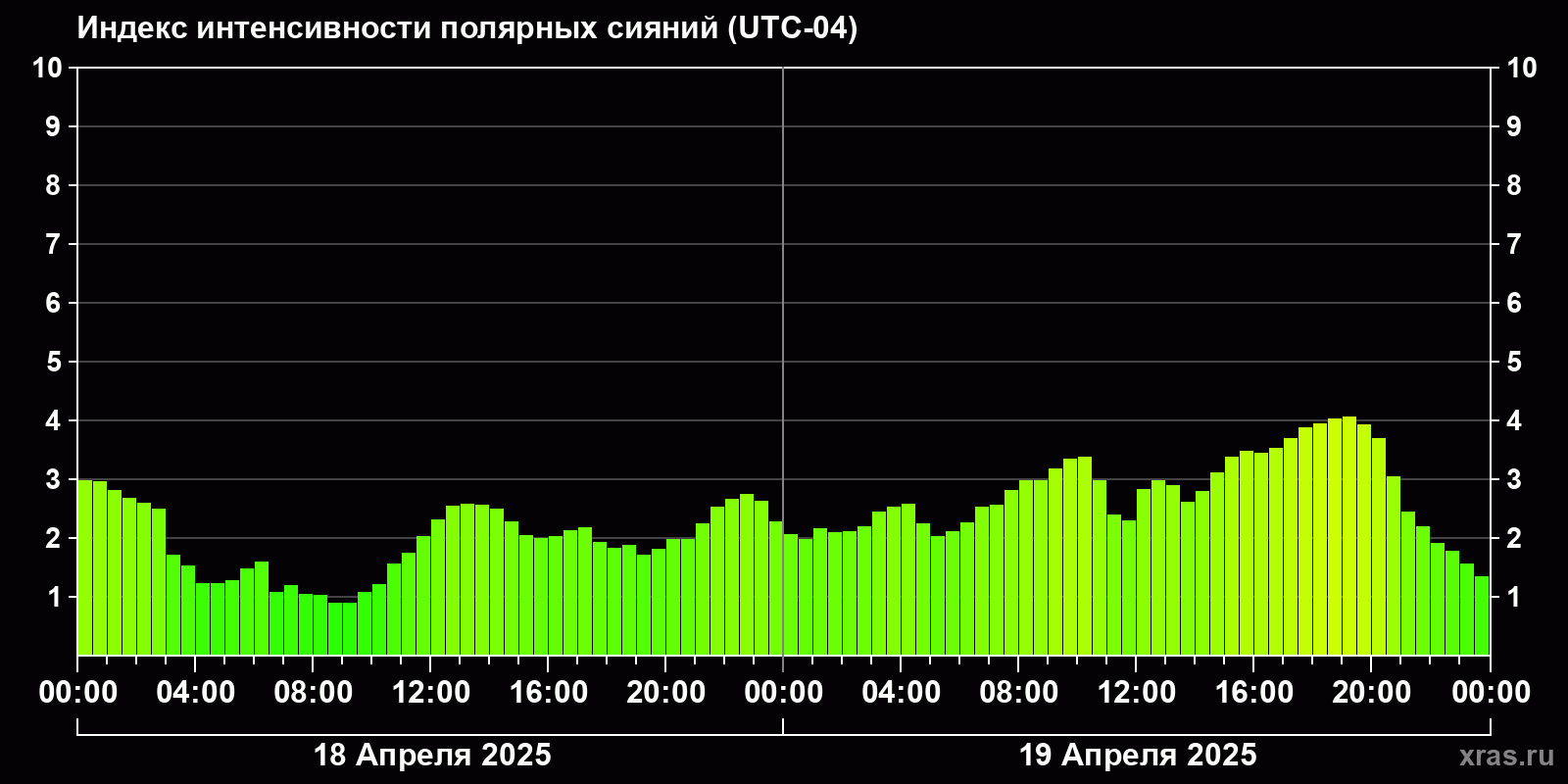 Изменения индекса интенсивности полярных сияний с 2025-04-18 по 2025-04-19 по местному времени