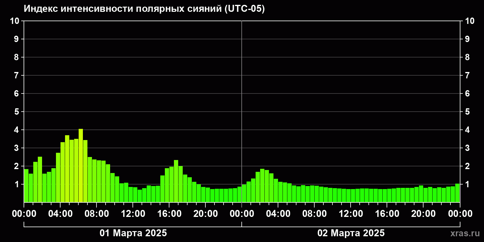 Изменения индекса интенсивности полярных сияний с 2025-03-01 по 2025-03-02 по местному времени