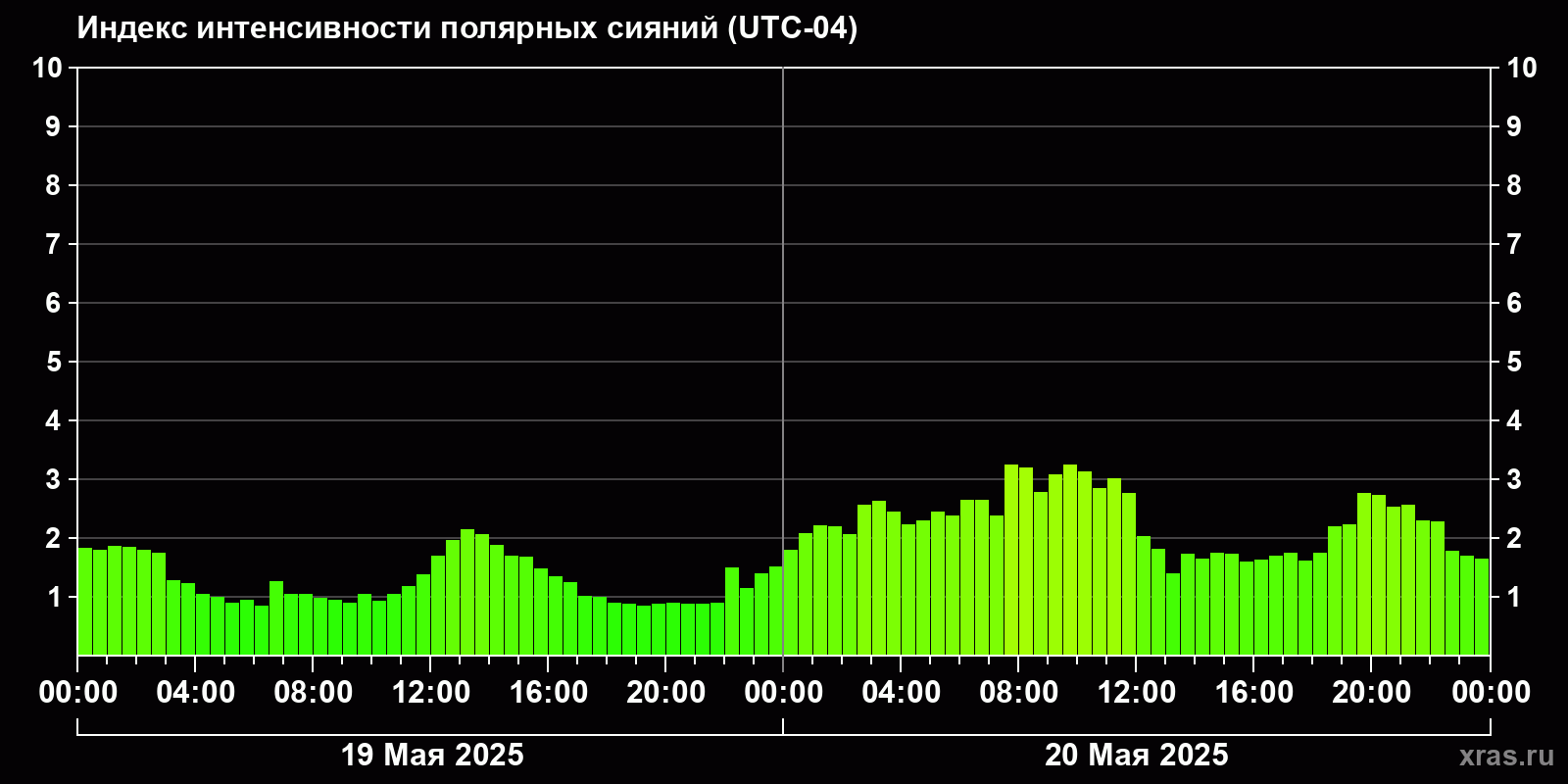 Изменения индекса интенсивности полярных сияний с 2025-05-19 по 2025-05-20 по местному времени