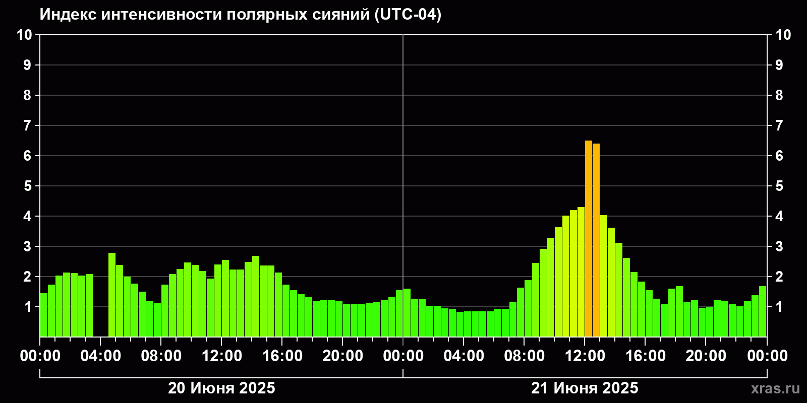 Изменения индекса интенсивности полярных сияний с 2025-06-20 по 2025-06-21 по местному времени