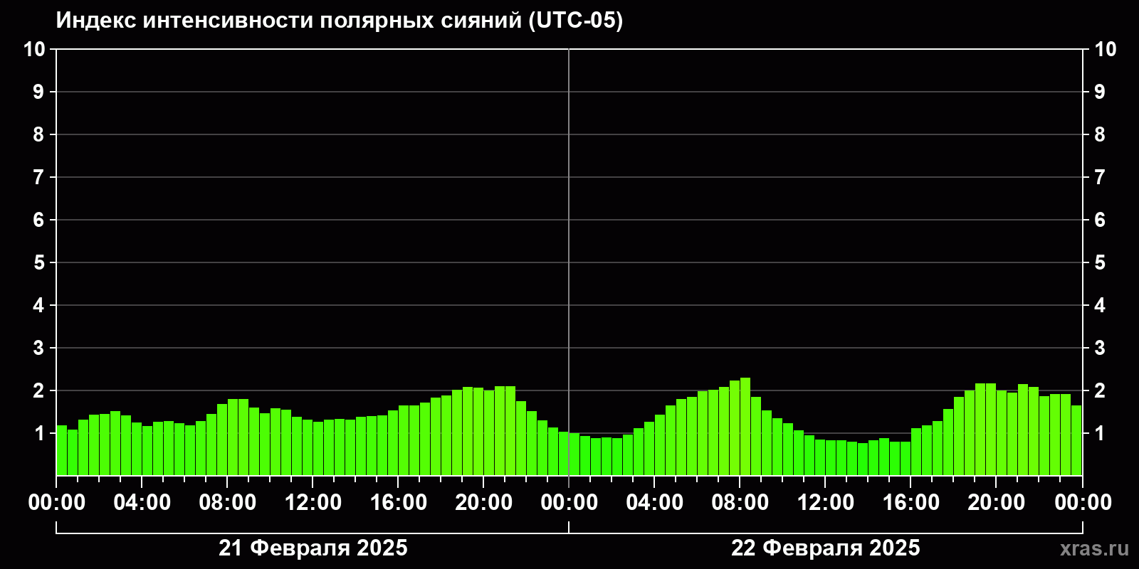 Изменения индекса интенсивности полярных сияний с 2025-02-21 по 2025-02-22 по местному времени