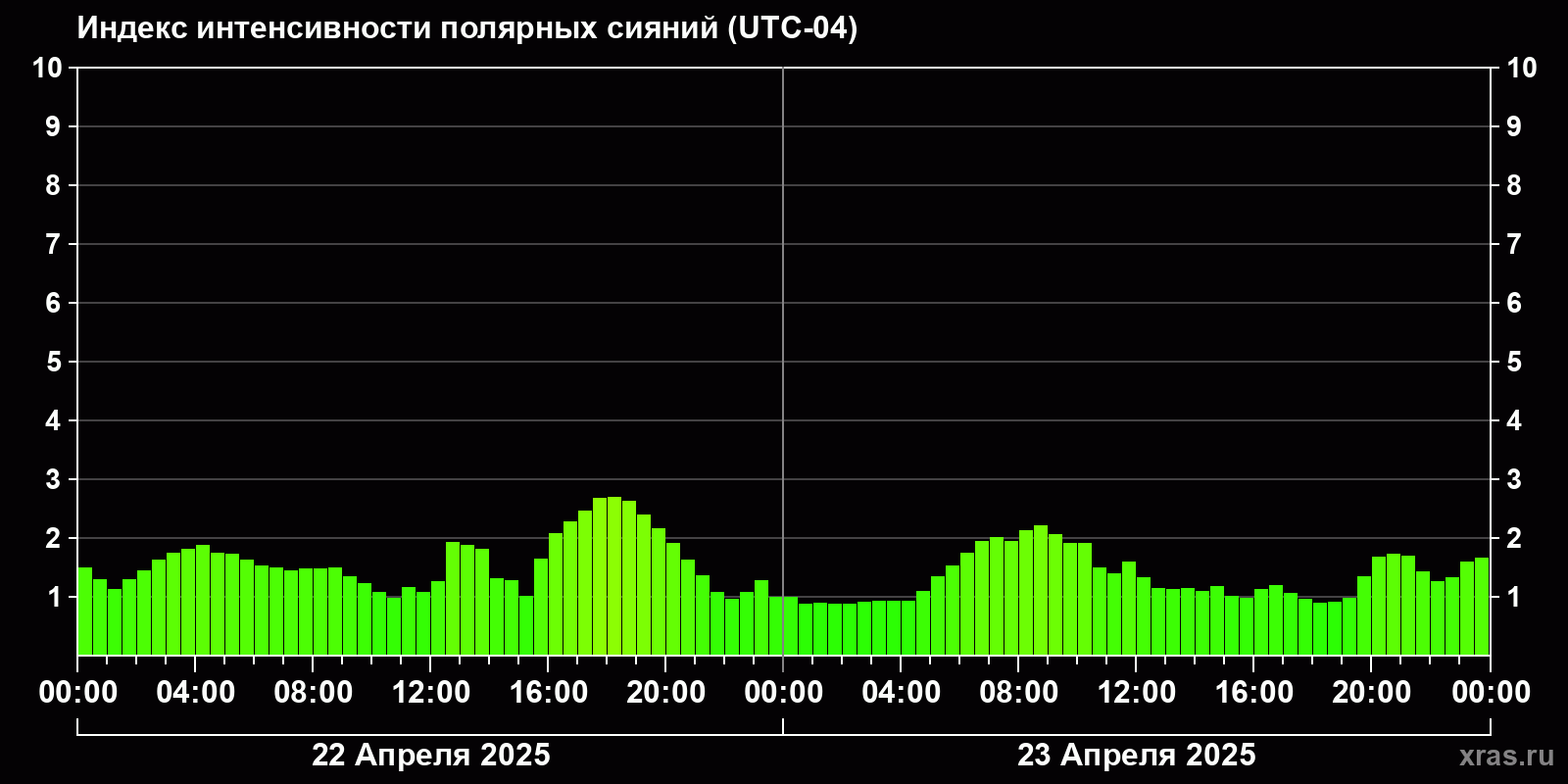 Изменения индекса интенсивности полярных сияний с 2025-04-22 по 2025-04-23 по местному времени