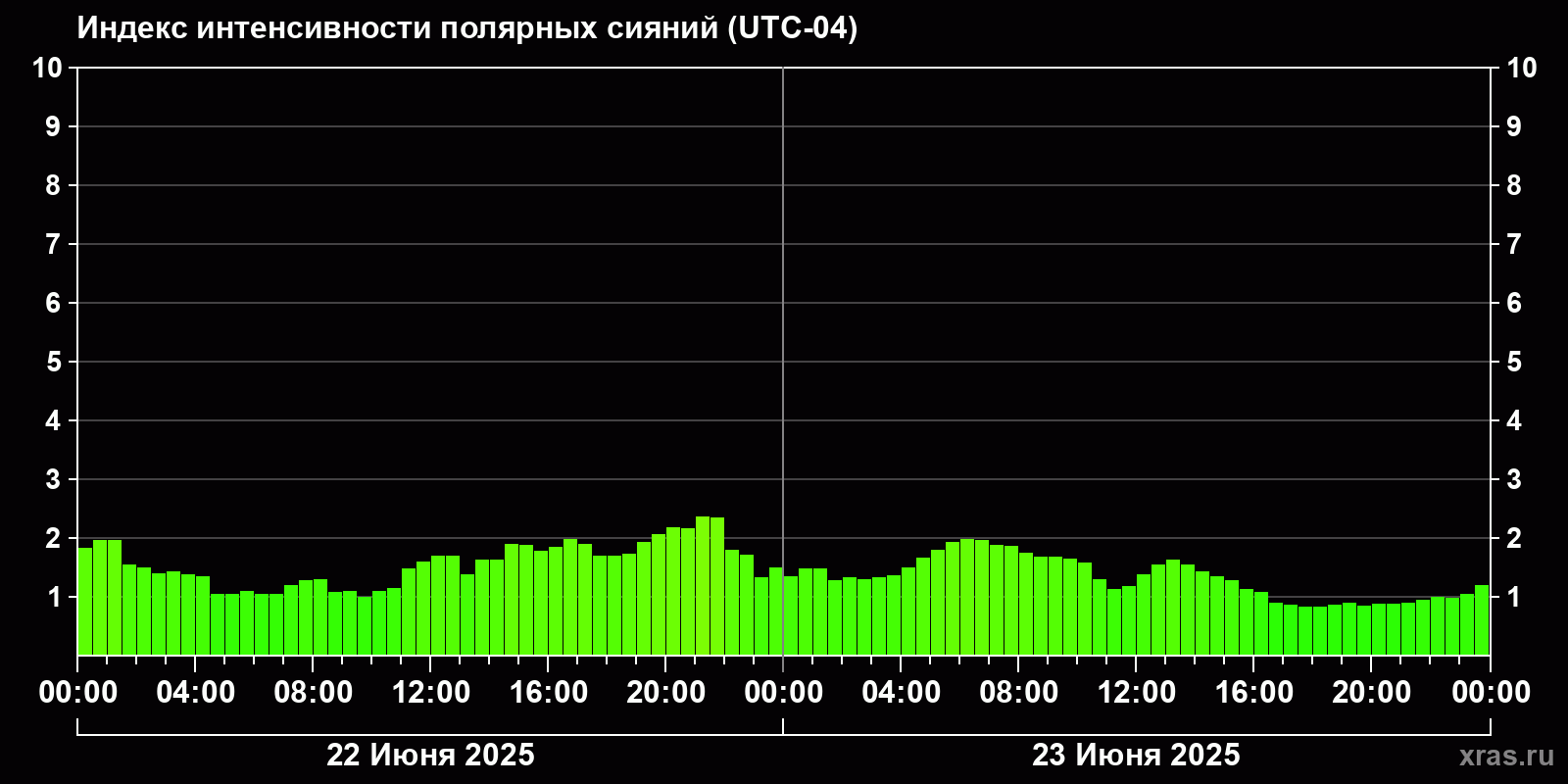 Изменения индекса интенсивности полярных сияний с 2025-06-22 по 2025-06-23 по местному времени