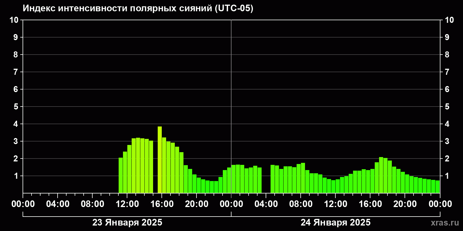 Изменения индекса интенсивности полярных сияний с 2025-01-23 по 2025-01-24 по местному времени